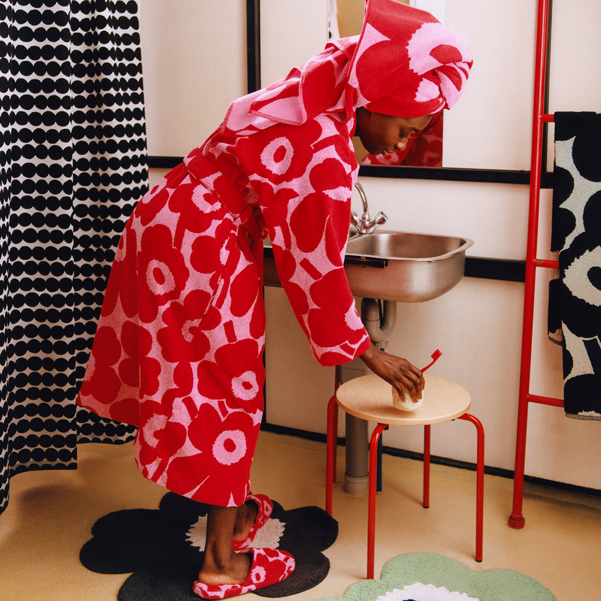 Wrap yourself in a cozy Marimekko bath robe after a steamy shower, bath, or sauna. The absorbent, soft cotton terry wicks moisture to keep you dry while the bright pink and red Unikko pattern keeps spirits high. Two roomy side pockets are perfect for warming hands or toting a grooming tools like a hairbrush. Two loops and a detachable belt allow it to be tied into the perfect fit.