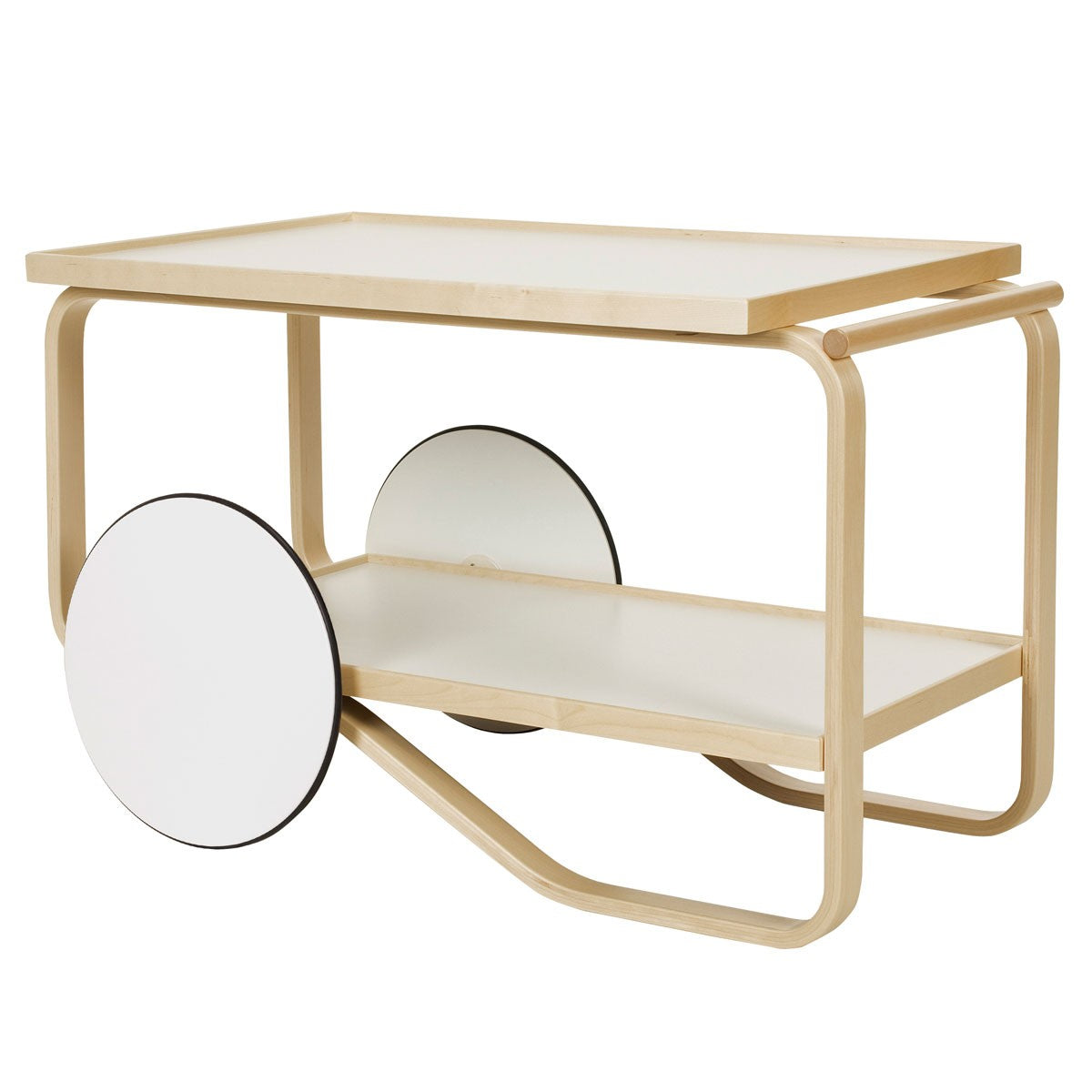 The 901 Tea Trolley was inspired by Japanese woodwork and British tea culture, which Aino and Alvar Aalto became acquainted with on their many travels. Designed in 1936, this piece has a frame composed of two birch lamella loops and features two shelves and a solid birch handle. The twin wheels allow it to be easily moved and parked at will, and the lightweight quality of the birch wood also supports this mobility. Choose between white laminate or black linoleum for the sleek and chic surface of the shelving and wheel faces.