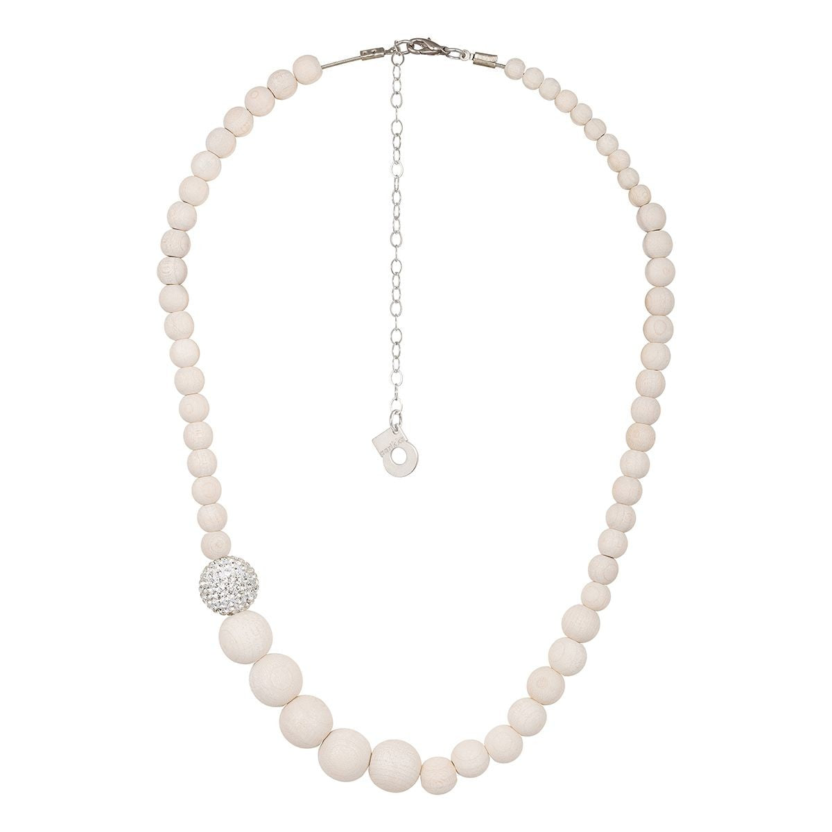 Eye-catching and elegant, the Bertta necklace brings bold beauty to any ensemble. The Bertta necklace features aarikka's signature wooden beads in varying sizes, which are contrasted by one crystal-coated bead on the side of the chain for a unique blend of shimmer and matte texture. Dress the necklace up for a night out or pair it with your everyday work attire: the natural ivory and silver hues will accent any occasion. The aarikka Bertta Necklace is handmade in Finland and includes an adjustable chain that can be worn longer, shorter, or in-between for the perfect fit.