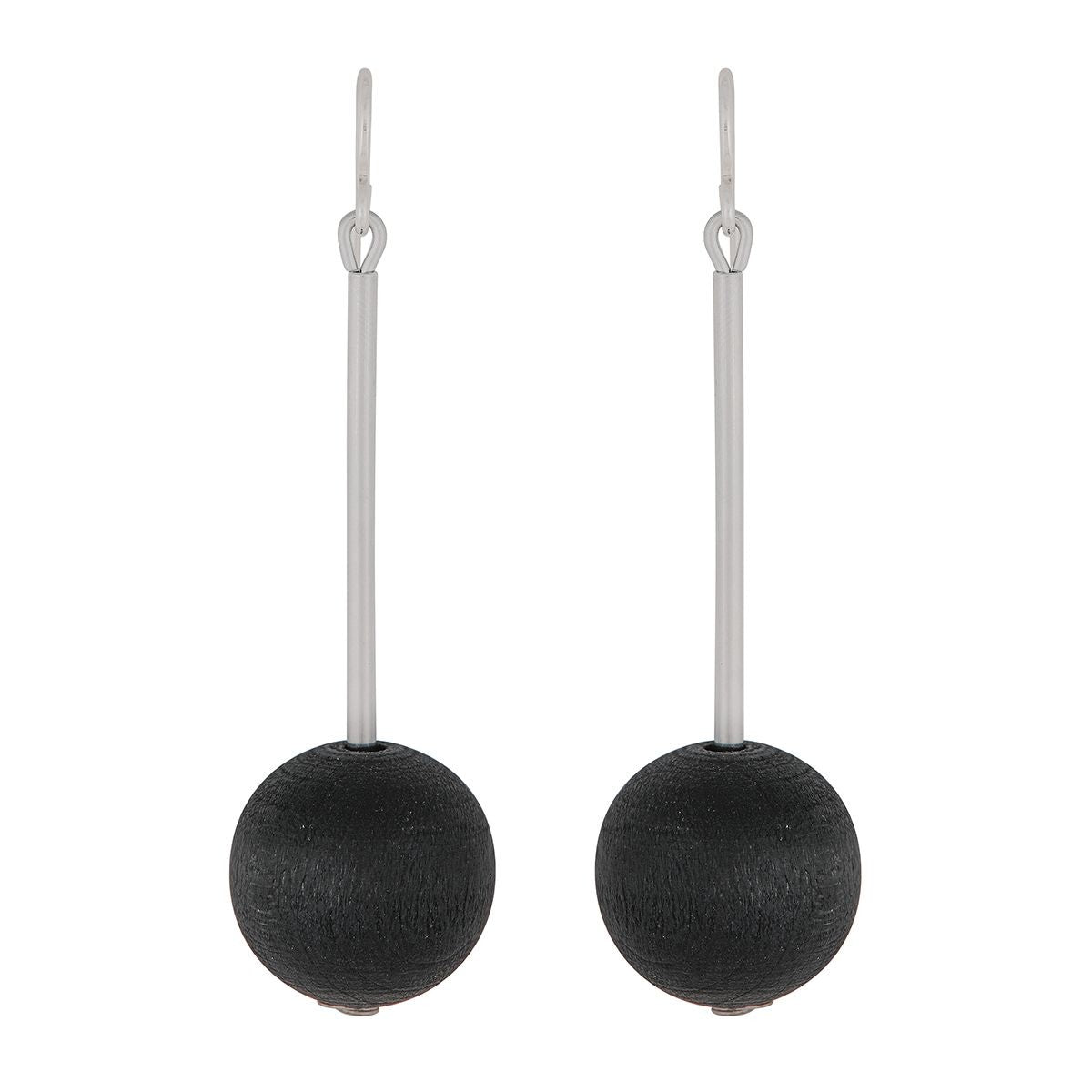 These elegant Elsa earrings feature aarikka's signature hand-dyed maple beads in a sleek matte black hue, which hang on a thin jewelry rod for a dramatic drop. Handmade in Finland, the nickel-free silver metal hooks offer natural movement while remaining light on the ear. Perfect for both a night out or everyday outings, the aarikka Elsa Black Earrings pair beautifully with other aarikka beaded jewelry for a playful yet polished look.