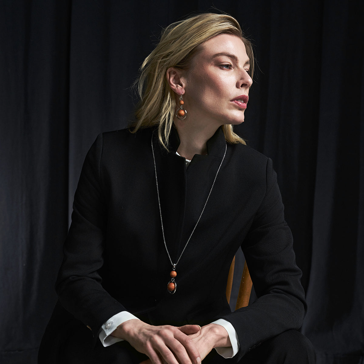 Classic round shapes are beautifully repeated in different materials in the aarikka Iisa jewelry collection. The Iisa necklace features aarikka's signature wooden spheres, which are hand-dyed in a warm, cinnamon orange hue. Contrasting beautifully against a shiny silver ring to dress up any ensemble, the long necklace includes an adjustable chain that can be worn at two different lengths. The aarikka Iisa Silver / Cinnamon Necklace is handmade in Finland and will be a one-of-a-kind addition to any jewelry collection.