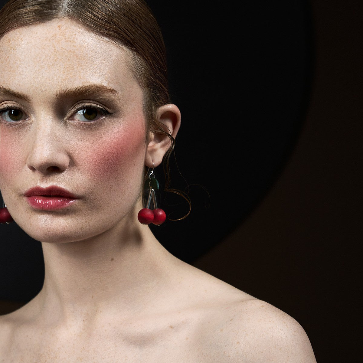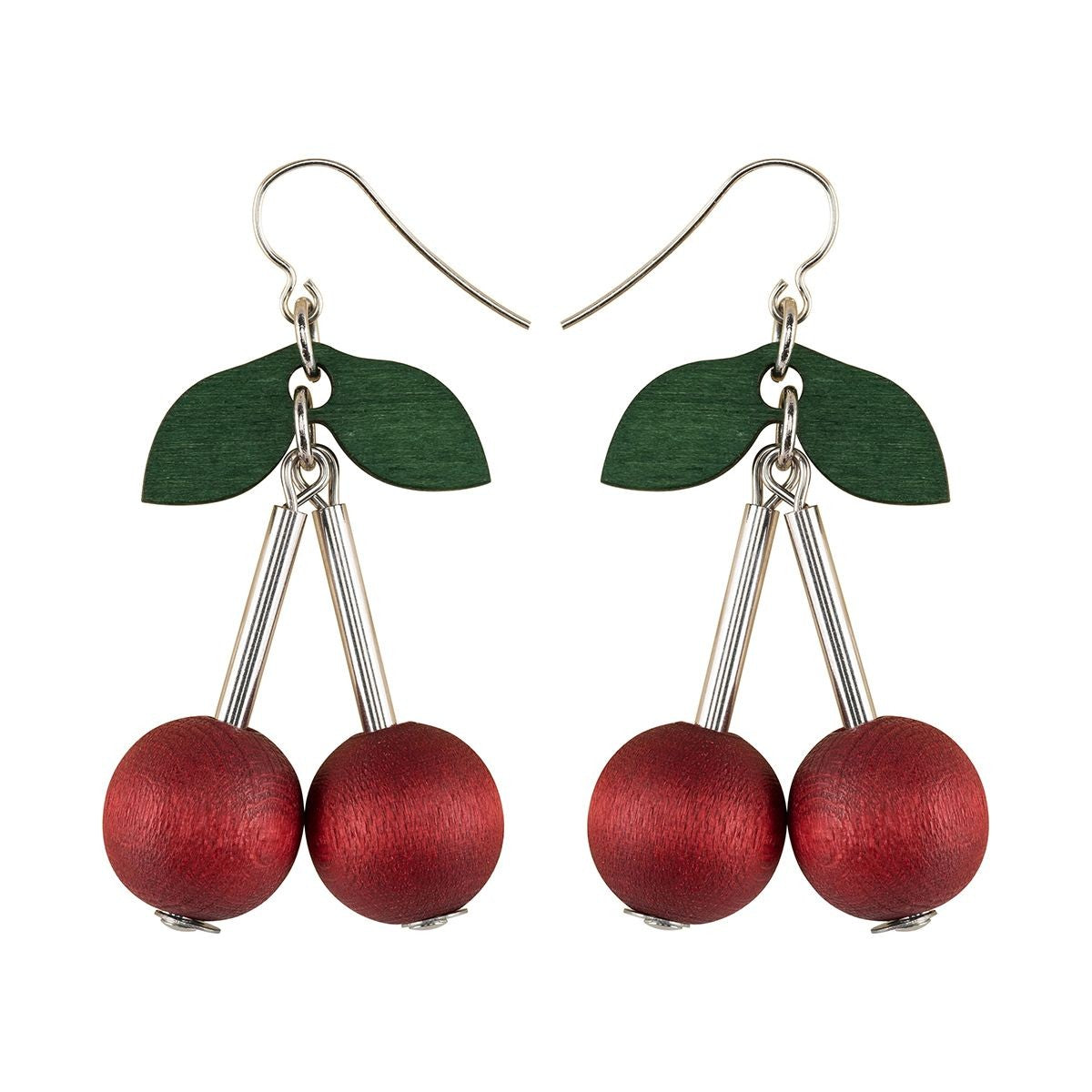 The Kirsikka (Cherry) earrings by aarikka bring sweetness to any ensemble. Hand-dyed and crafted with aarikka's signature wooden beads, these lovely dark red cherries are accented by green leaves, which dangle from nickel-free silver metal hooks for natural movement. Made in Finland, the aarikka Kirsikka Earrings bring a bold and playful accessory to any jewelry collection, and can be paired with other beaded aarikka jewelry for a fun and polished look.
