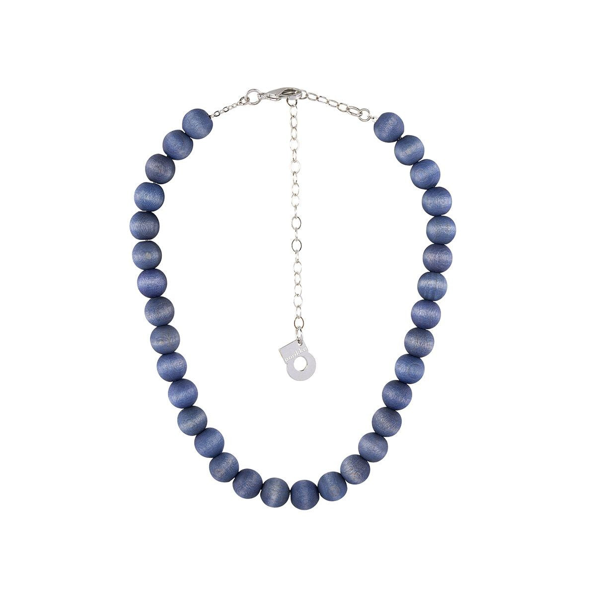 The delicate Sara necklace features aarikka's signature wooden spheres, but smaller, beaded on a shiny silver chain. Made in Finland from hand-dyed maple beads in a beautiful blue-grey hue, the necklace is adjustable, though it has a shorter chain length that rests high up on the neck. Dress the Sara necklace up for a night out or pair it with your everyday work ensemble, as the necklace's elegant yet playful look will become a versatile closet staple. Aarikka's initial charm is included in the chain for unique contrast against the bead's matte texture.