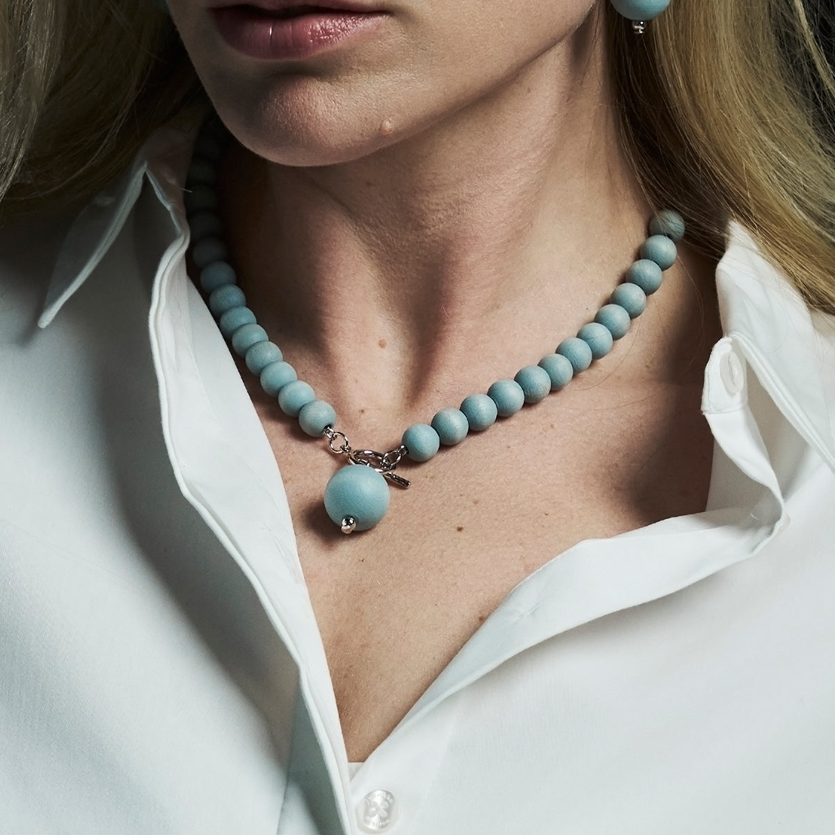 The aarikka Valma Necklace features wooden beads playfully combined with metal parts. Aarikka's signature spheres string along the chain in a hand-dyed light blue hue, meeting at the necklace's front-facing toggle clasp. Below the clasp hangs a larger wood ball, which lays just below the collarbone. Handmade in Finland from maple wood and plated brass, the aarikka Valma Light Blue / Silver Necklace will be a unique addition to any jewelry collection and add captivating color to any ensemble.