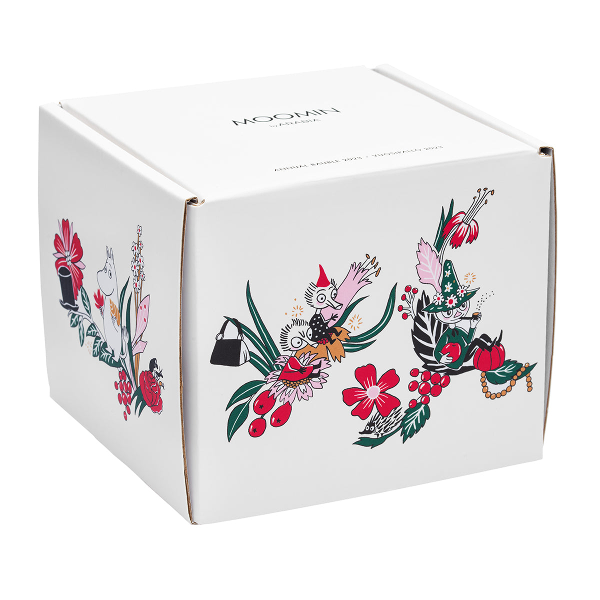The Arabia Moomin 2023 Annual Bauble depicts a scene from Finn Family Moomintroll, with Moomintroll and Snufkin on an adventure joined by mysterious Thingumy and Bob. Based on Tove Jansson's original classic wreath illustrations, festive red, green and pink hues illuminate atop the white porcelain bauble. To gift or to keep, the limited-edition 2023 annual bauble by Arabia will add Moomin magic to any tree, mantle, decorative branches and more. It's packaged in a matching gift box and includes a red ribbon for easy hanging.