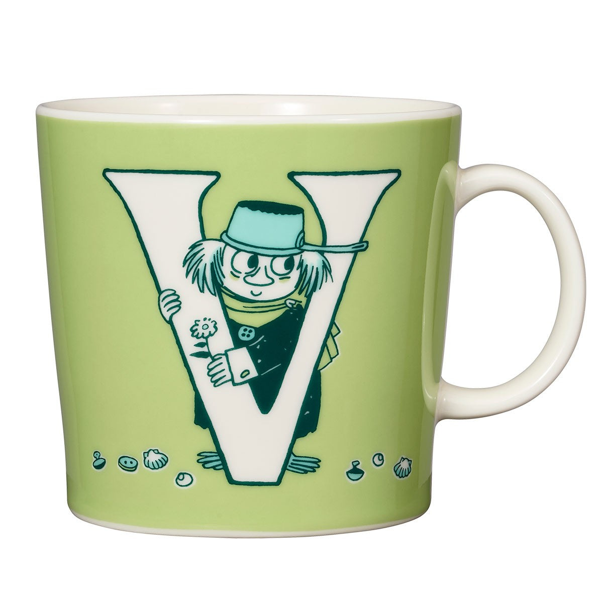 A part of Arabia's ABC Collection, this Moomin mug features a decorative "V" with an infatuated Fuddler who is longing for Mymble. Fuddler's love, however, is not reciprocated as Mymbel is currently longing for a psychiatrist named Dr. Hatter. The illustration on the mug's backside is based on the comic "Fuddler's Courtship." Perfect as a stand alone, you can also complete the playful collection and form the word "LOVE." The Moomin ABC mugs are crafted from porcelain and are microwave, oven, freezer, and dishwasher safe. Included is an identifying stamp on the bottom and an attached gift tag with a "To:" and "From:" line if giving this mug to a Moomin fan as a meaningful gift.