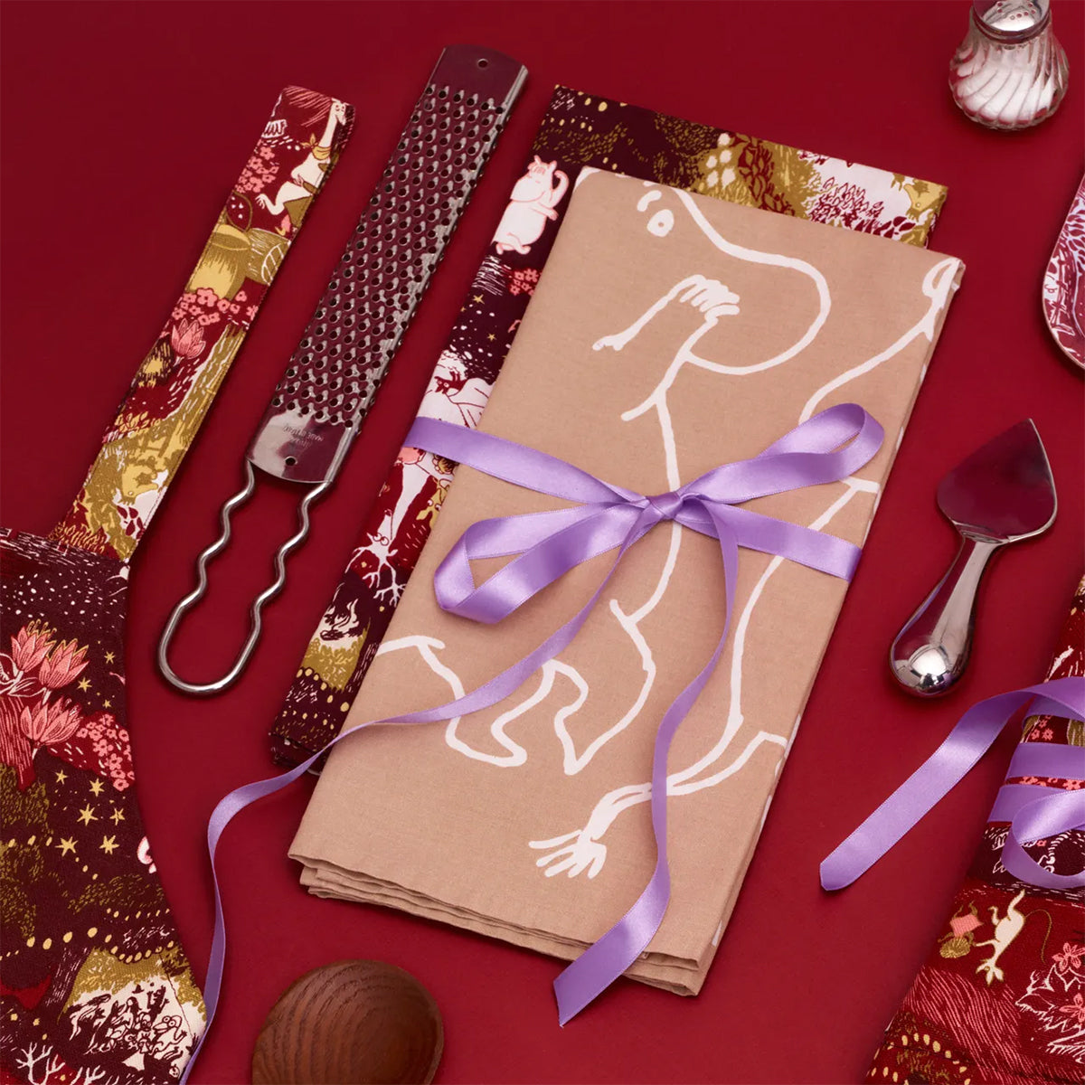 Celebrating the end of the Moomin 80 year with pancakes and fireworks, the Festive Moments collection finds the whole Moomin crew seated around a large table, sharing food and raising a toast as the whole valley is lit up with fireflies and glowing worms. From the novel Finn Family Moomintroll, this special illustration by Tove Jansson celebrates being together and showing gratitude to friends and family wherever they may be. To gift or to keep, the Moomin Arabia Festive Moments Tea Towel Set is made of 100% organic cotton and will be just as handy in the kitchen as it is adorable.