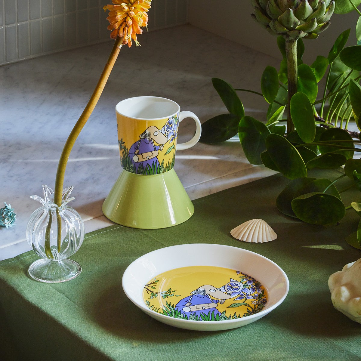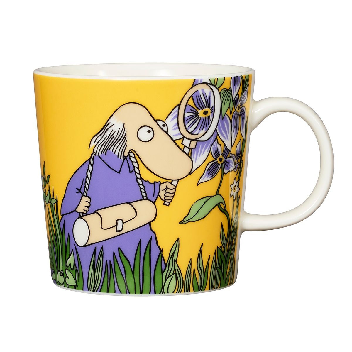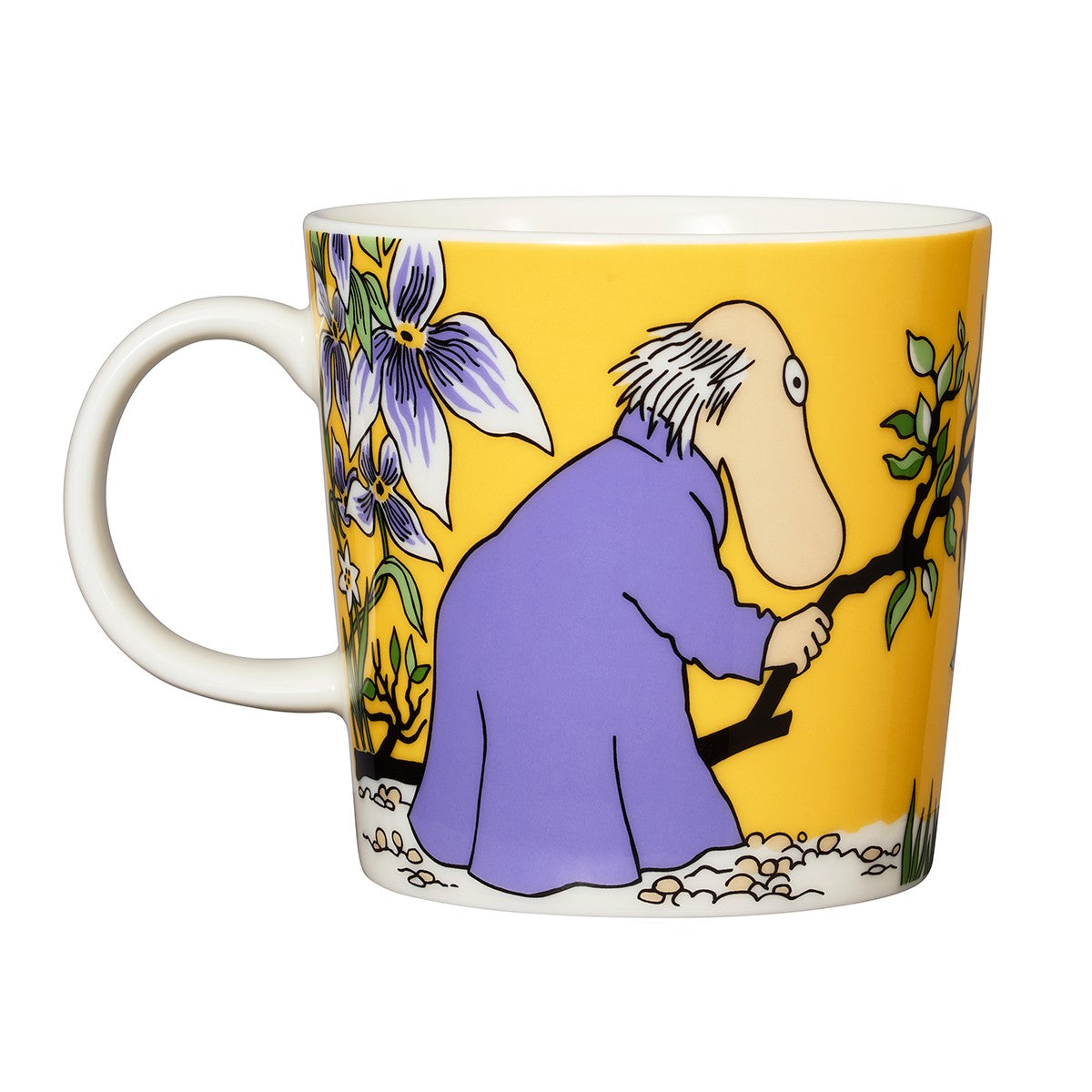 The Hemulen is a passionate plant collector, and atop this mug by Arabia, he examines and picks rare collectibles as he travels to the Hattifatteners' island. Wearing his signature lilac-colored dress and illuminated by a bright yellow backdrop, the illustrations are based on author Tove Jansson's novel Finn Family Moomintroll from 1948. The Moomin mugs are crafted from porcelain and are microwave, oven, freezer, and dishwasher safe. Included are special details, like an identifying stamp on the bottom and an attached gift tag with a sweet story about the design: