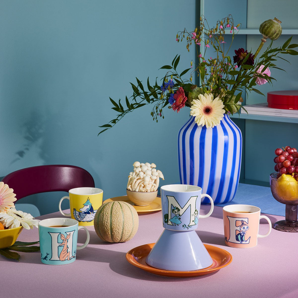 A part of Arabia's ABC Collection, this Moomin mug features a decorative "M" and an original scene from Tove Jansson's story "Finn Family Moomintroll." The front side of the mug features Thingumy and Bob hiding in the Moomin's basement, while the illustration on the back features Hemulen offering milk to the pair. Perfect as a stand alone to represent a name initial, you can also complete the playful collection and form the word "HOME." The Moomin ABC mugs are crafted from porcelain and are microwave, oven, freezer, and dishwasher safe. Included is an identifying stamp on the bottom and an attached "To" and "From" gift tag if giving this mug to a Moomin fan as a meaningful gift.