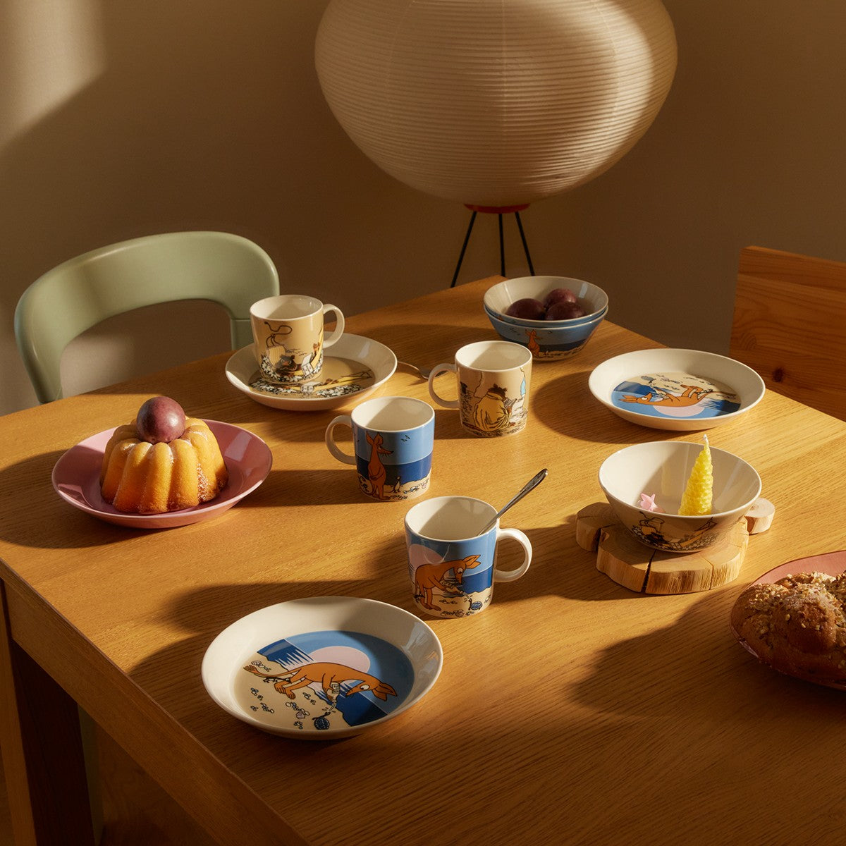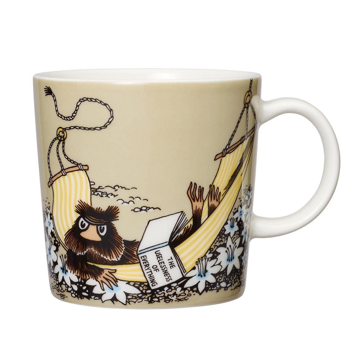 The philosophical Muskrat is reading "The Uselessness of Everything" in his favorite spot, a hammock in the garden at Moominhouse, until he falls to the ground after a rope breaks. Embarrassed and restless, the next illustration shows him isolating at a beach cave where he is uninterrupted. Arabia Moomin mugs are crafted from porcelain and are microwave, oven, freezer, and dishwasher safe. The mugs have special details, like an identifying stamp on the bottom and attached gift tag with a sweet story about the design.