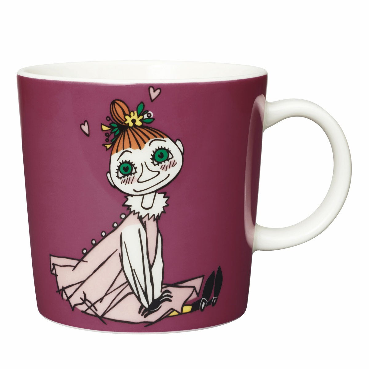 Mymble is sitting and daydreams in up back-buttoned dress on this wine-colored mug. Moomin-founder Tove Jansson created the original illustration, which appears in the book "Moominsummer Madness." It was then interpreted by Tove Slotte, who beautifully took the classic from paper to porcelain.