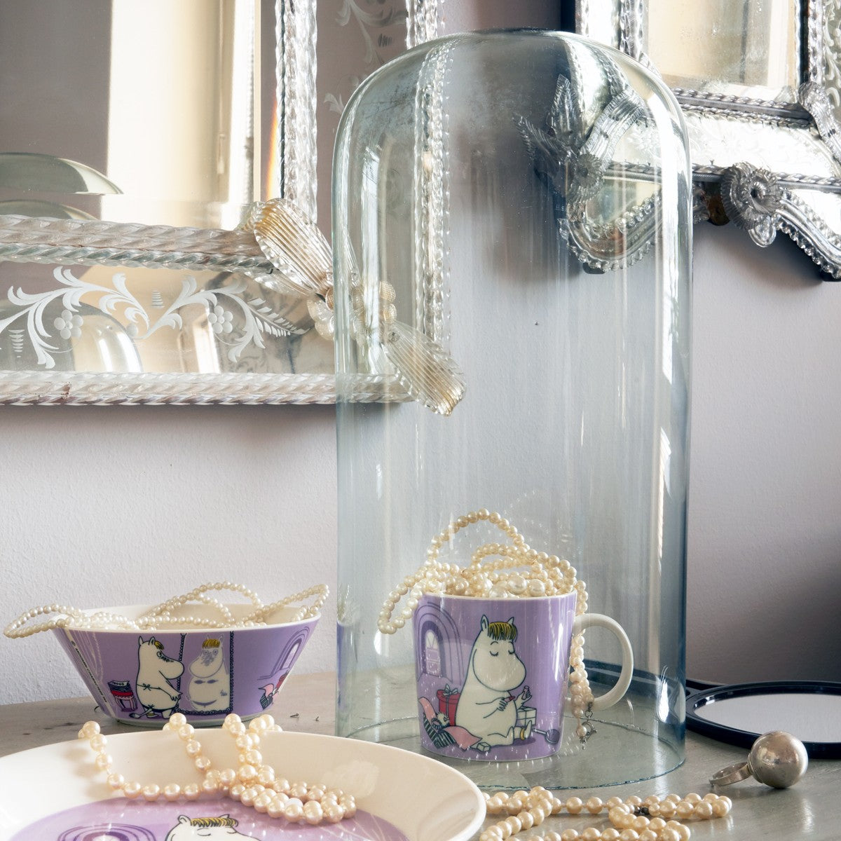 This lilac-colored mug features Snorkmaiden getting dolled up with lipstick among gifts on one side and modeling a bikini in the mirror on the other. Tove Jansson created the Moomins in 1945, and they have been capturing hearts ever since. Tove Slotte created these illustrations, taking the classic comics from paper to porcelain beautifully. As always, the Moomin mugs are crafted from porcelain and are microwave, oven, freezer, and dishwasher safe. The new mugs have special details, like an identifying stamp on the bottom and attached gift tag with a sweet story about the design.