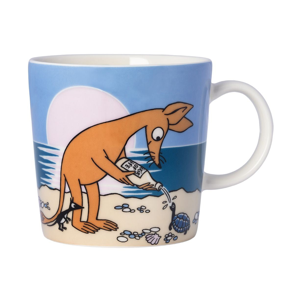 Sniff is standing beachside and dreaming of fame and fortune atop this new addition to Arabia's beloved mug collection. All in the company of a little character called Shadow, one side shows Sniff offering the "Elixir of Life" to a turtle, while the other side shows him staring out at sea and dreaming of riches. Arabia Moomin mugs are crafted from porcelain and are microwave, oven, freezer, and dishwasher safe. The mugs have special details, like an identifying stamp on the bottom and attached gift tag with a sweet story about the design.