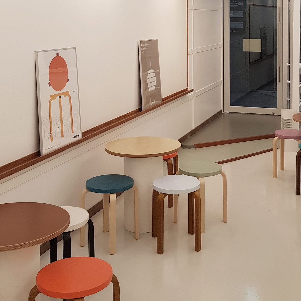 The visionary of renowned Finnish architect/designer Alvar Aalto, the iconic Artek Alvar Aalto Stool E60 turns 80 in the year 2013. The stackable, four-legged stool was built using revolutionary techniques at the time and paved the path for subsequent design classics. Special edition colors taken directly from Alvar's Paimio Sanatorium, the first building he designed that was furnished entirely with his own factory-made furniture, are now available to celebrate this milestone. The yellow of the floors, the green of the walls, the turquoise of the handrails and walls, and the orange, white and black of the furniture of the Paimio Sanatorium inspired this anniversary edition. This four-legged stool consists of a lacquered blue seat and natural birch legs. Designed in 1933, this timeless design is still one of the most famous classics internationally.