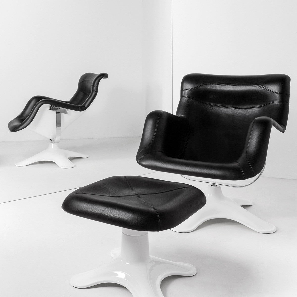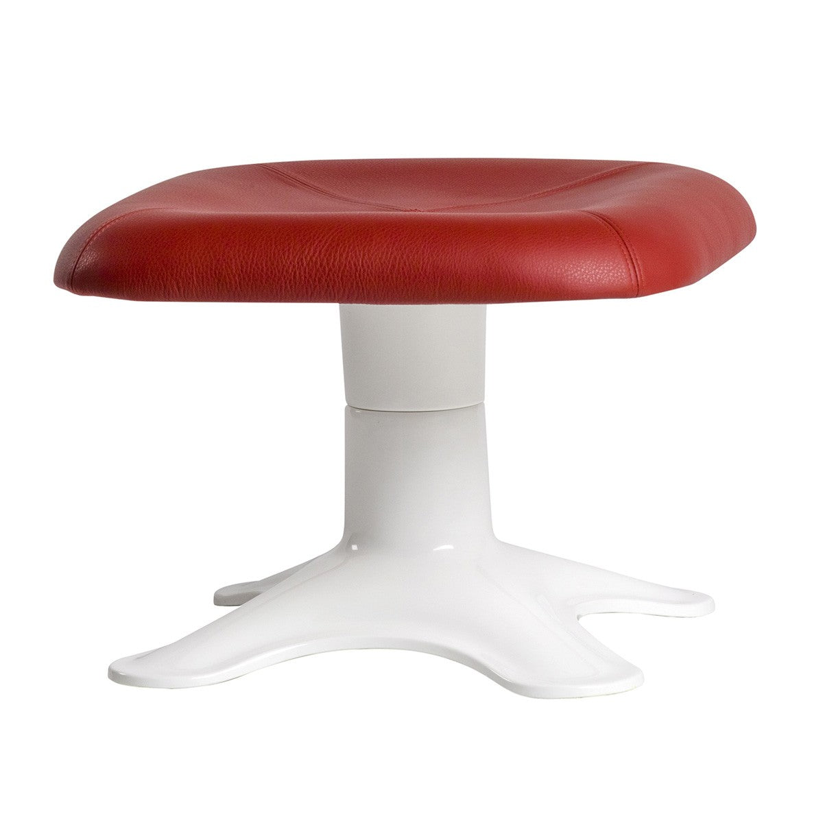 The Karuselli Lounge Chair was designer Yrjö Kukkapuro's way of combining function, ergonomics, and organic form for maximum comfort. He got the idea for the design when building "snow chairs" with his daughter outside. Kukkapuro spent years sculpting the chair to achieve the perfect dimensions, echoing the shape of the human body. In 1964, he completed the iconic form along with this matching ottoman. The design was an immediate success, and two years later it was chosen by Gio Ponti to grace the cover of Domus. Sir Terence Conran has even proclaimed the Karuselli to be his favorite chair. The base and shell of both the chair and this ottoman is crafted from fiberglass with a Sörensen Prestige leather top in your choice of red, black, or white.