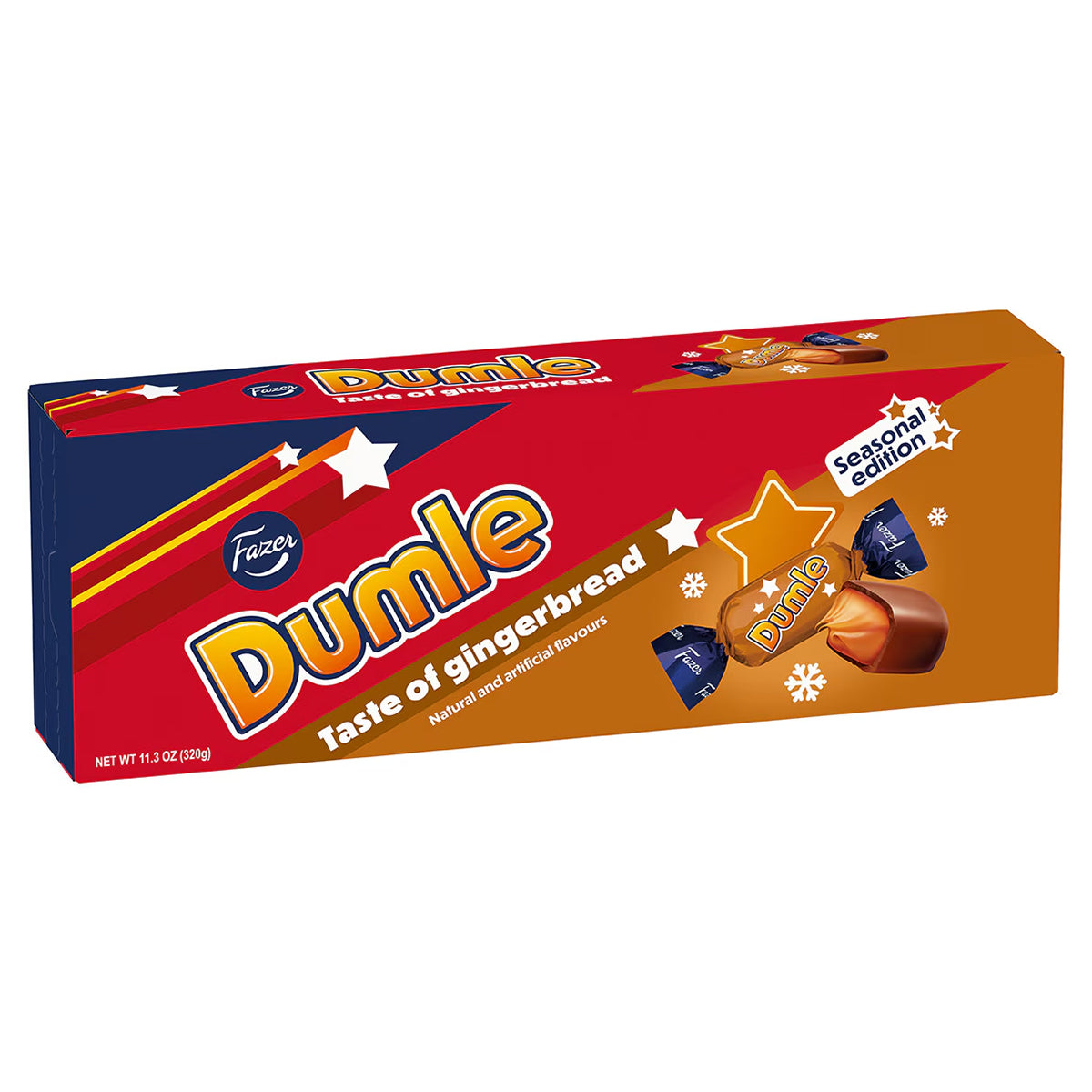 Fazer's fan-favorite soft toffees have the same decadent milk chocolate coating, but with a tasty burst of gingerbread inside. The Dumle Gingerbread Flavored Filling Box will be a joyful treat at a holiday gathering or for your own indulgence. Approximately 43 wrapped candies come inside a box, meaning it also makes the perfect stocking stuffer or gift for a special sweet-tooth.