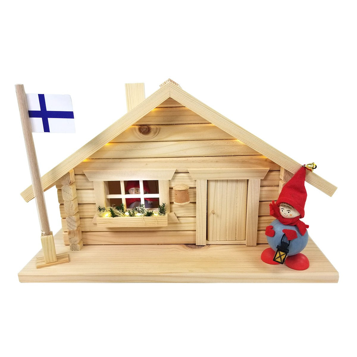 Beautifully handcrafted in Finland from natural pine, this wood model of a Finnish cabin is truly enchanting and stunning. A window in the front offers a glimpse inside and if you look closely, you'll see a tonttu gazing outside. It's a beautiful holiday accent for your home day or night. Not a single detail was overlooked in its craftsmanship; even the window box has plantings, and the front door actually opens and closes.