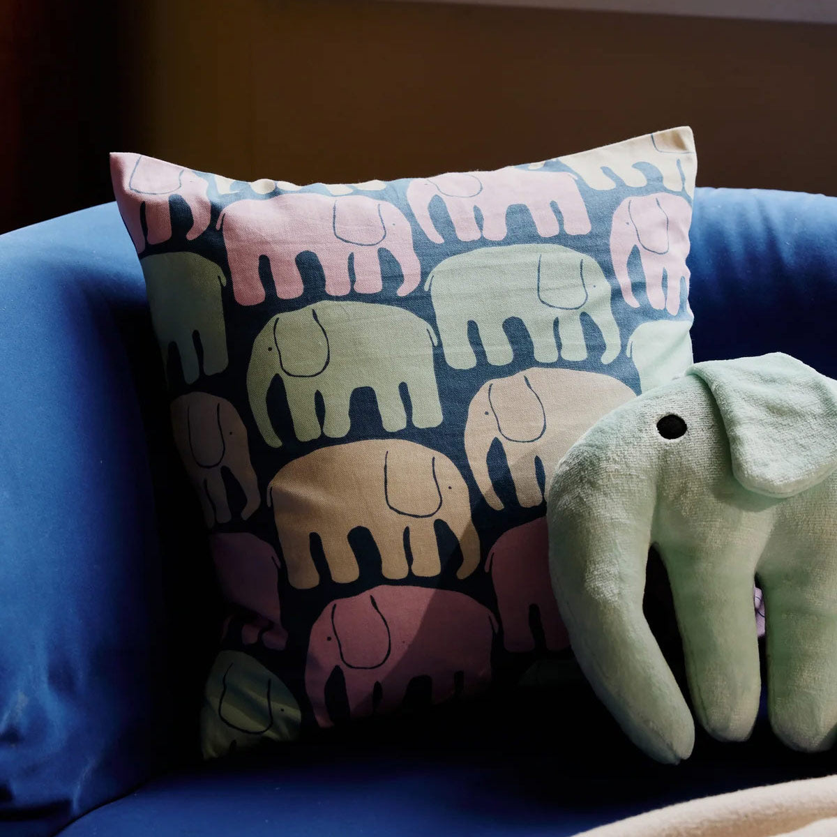 This lovable herd of elephants in pretty pastel hues will bring instant charm to any sofa, bed, chair, bench and more. The Finlayson Elefantti (Elephant) print by Laina Koskela won a design competition back in 1969 and has been a mainstay favorite ever since. Here, mint green, pink, and light orange elephants alternate atop a dark blue backdrop. The Finlayson Elefantti Throw Pillow is made from 100% soft yet durable cotton, and includes a discreet zipper on the back for easy removal of the cushion insert.