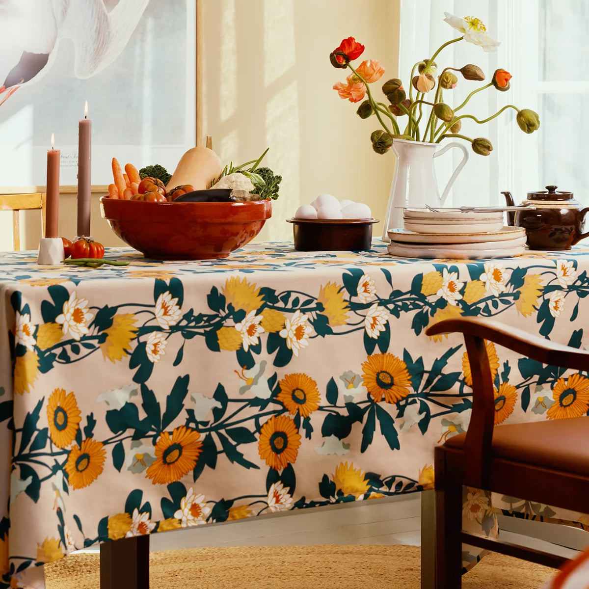 Reserve this blooming beauty for special occasions or make it an everyday staple at your dining table. This rectangle tablecloth by Finlayson showcases two different flowers that alternate and vine vertically in warm orange, beige and green hues. The tablecloth is made from 100% cotton and woven into a firm rib weave, meaning half of the threads are doubled to give the fabric a sturdy and thick feel. Complete the table setting and bring lush beauty to every meal with the Finlayson Kaksin Tablecloth.