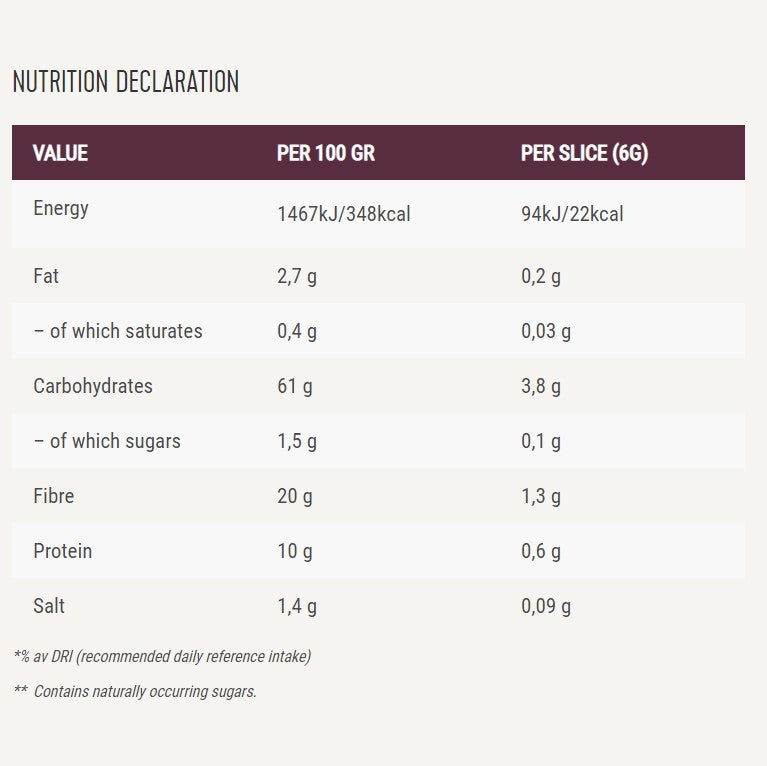 INGREDIENTS: Wholegrain rye flour 94 %, water, salt, yeast, and caraway. May contain traces of sesame seeds.
