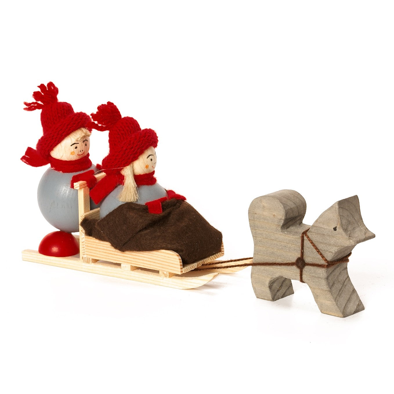 Tonttus are the most important helpers of Santa, but the huskies are helpful to the tonttus, too! Here, Pyry and Tessa take a sleigh ride with their canine friend. Knit red hats, scarves, and even a blanket keep them cozy on the chilly adventure. Packaged in a gift box, the Pyry, Tessa & Husky Tonttu set makes a lovely gift or holiday decor for your own mantle.