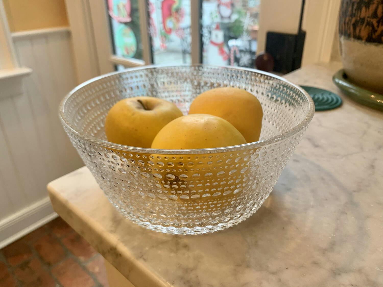 The iittala Kastehelmi Dewdrop Clear Small Serving Bowl is truly a piece to be proud of at the table. Named Kastehelmi (Dewdrop) after the bubbled detailing on the pressed glass, this collection was originally produced from 1964-1988 and brought back to celebrate Oiva Toikka's 50 year mark as a designer. The 1.5 qt (1.4 L) bowl is great for serving salads or casseroles at small gatherings, where family and friends will appreciate its timeless beauty.