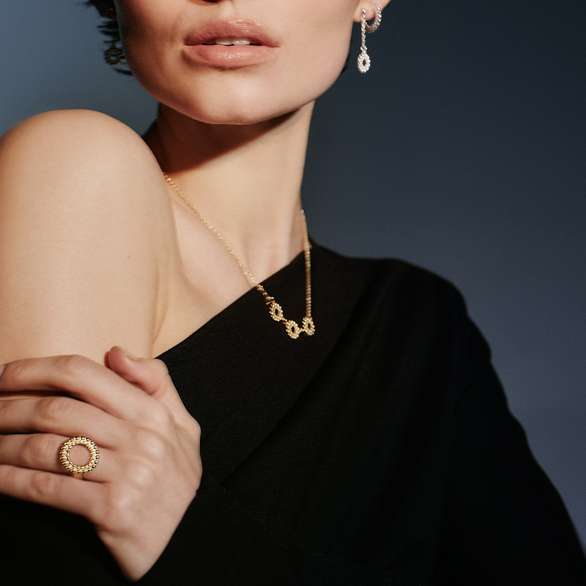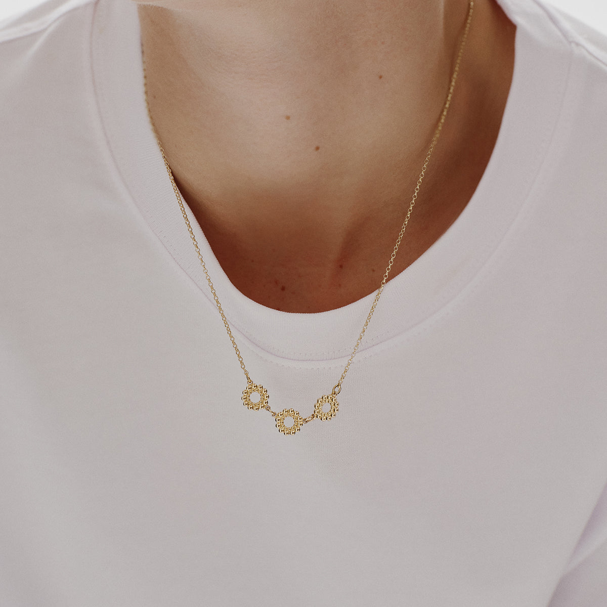 The Kalevala Valoisa, or "Circle of Light" collection reflects its name with bright, shiny loops of bronze. The Circle of Light Necklace includes three small round pendants, featuring a textured and bubbled surface for visual interest. Handmade in Finland and designed by Tiina Arkko, the gold chain is adjustable in length and features a simple spring ring clasp closure. Whether you wear it on a night out or with your everyday attire, the Kalevala Circle of Light Bronze Three Part Pendant will add effortless elegance to any outfit.