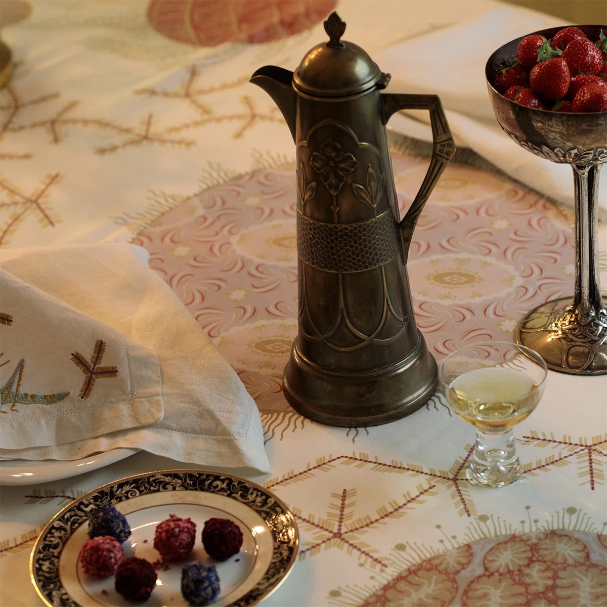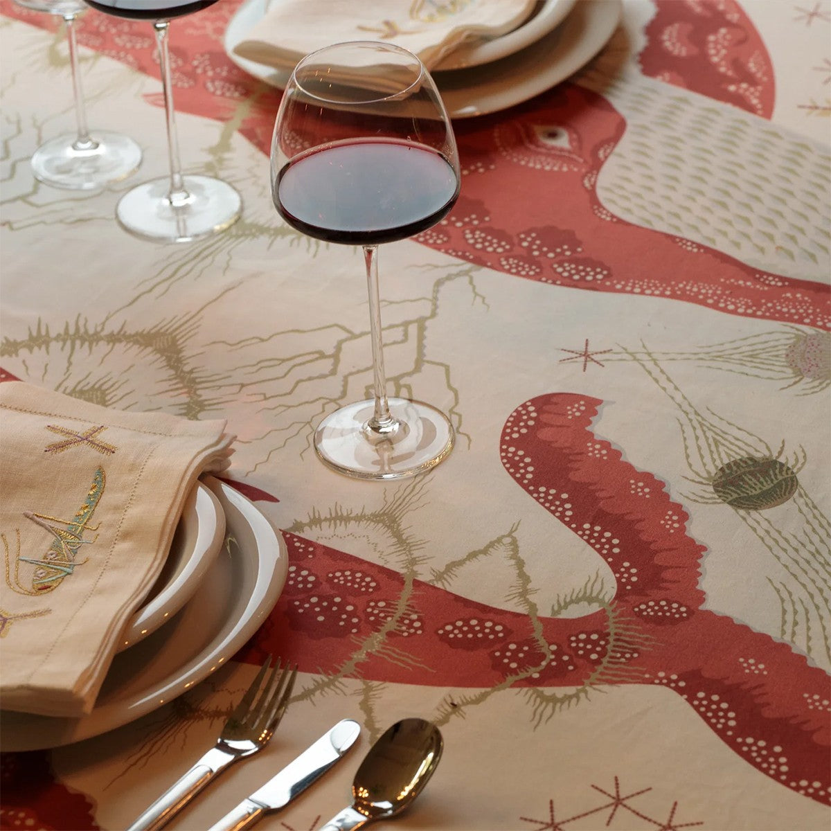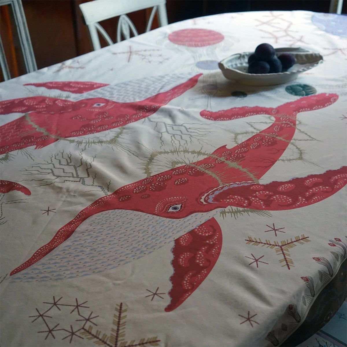 Let the table setting come to life with Klaus Haapaniemi's aquatic "Astral Sea" print. Featuring the pink Cosmic Whale and other deep sea elements, this long tablecloth will be a magical and eye-catching table foundation for both everyday dining and elegant dinner parties. It's made from a machine-washable cotton satin blend, which features a subtle sheen to accentuate the cream, pink, purple and brown hues. The Klaus Haapaniemi Astral Sea Tablecloth is a limited-edition print that captures the mystery of the ocean and will be a showpiece for years to come.