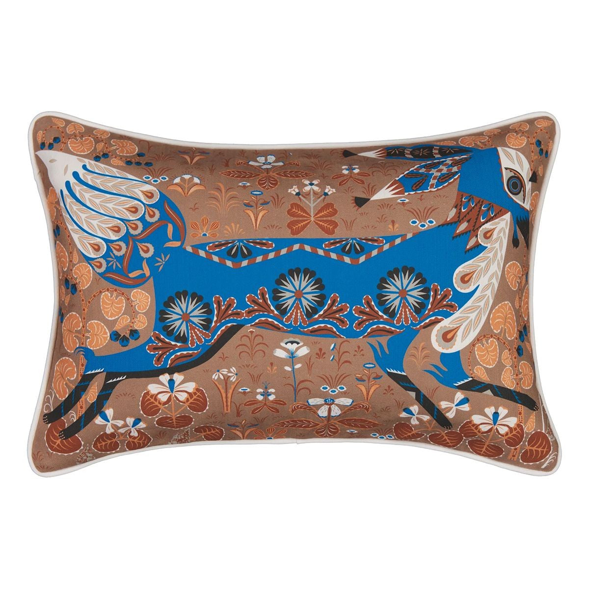 A fox is on the run, but it's easily captured on your couch with this fan-favorite throw pillow from Klaus Haapaniemi. His whimsical design looks like something from a fairy tale, with a detailed blue fox dashing through an earthy brown field. The design is printed on a quality cotton-linen cushion cover, which is easily removed from an insert via a discreet side zipper. The Klaus Haapanieni Running Fox Brown Lounge Pillow features the same design on the reverse side, and thick white piping frames the illustration with clean contrast.