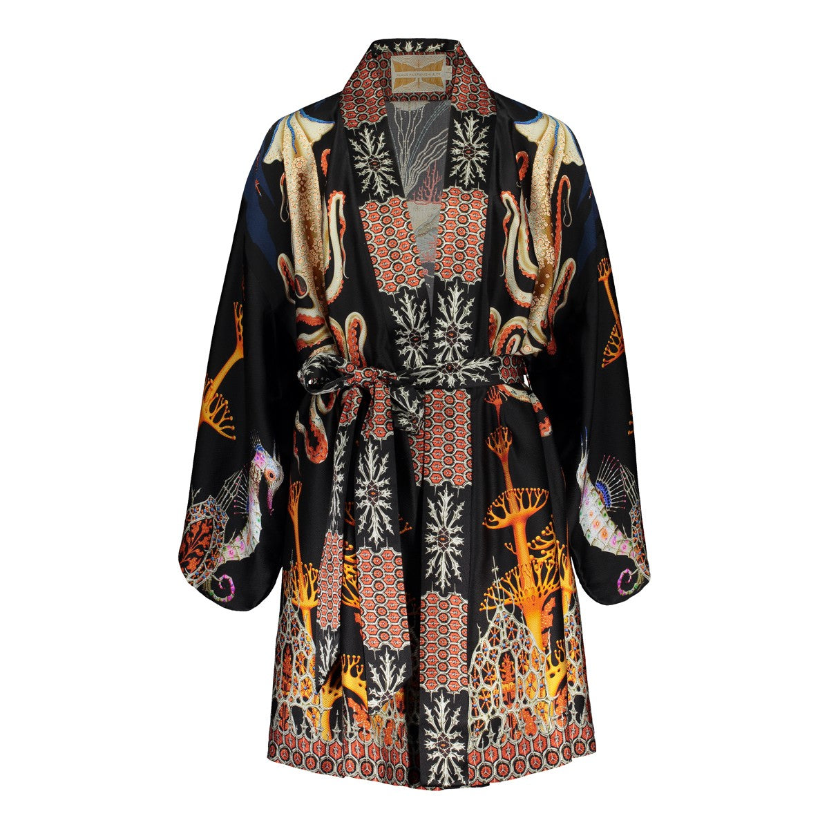 Wrap yourself in luxury and whimsy with this wearable art by Klaus Haapaniemi. This kimono depicts a magical underwater world in brilliant colors of orange, yellow, red, and turquoise on a black backdrop. It's beautifully crafted from 100% hammered, heavyweight silk to feel as lavish as it looks. A matching, removable waist tie allows it to be worn open or closed. Available in two unisex sizes, the small/medium is shorter in overall and sleeve length, while the large/x-large is the most popular choice for men. The Klaus Haapaniemi Notre Dame Silk Kimono also makes a great gift for someone with a rich imagination and appreciation for daring detail.