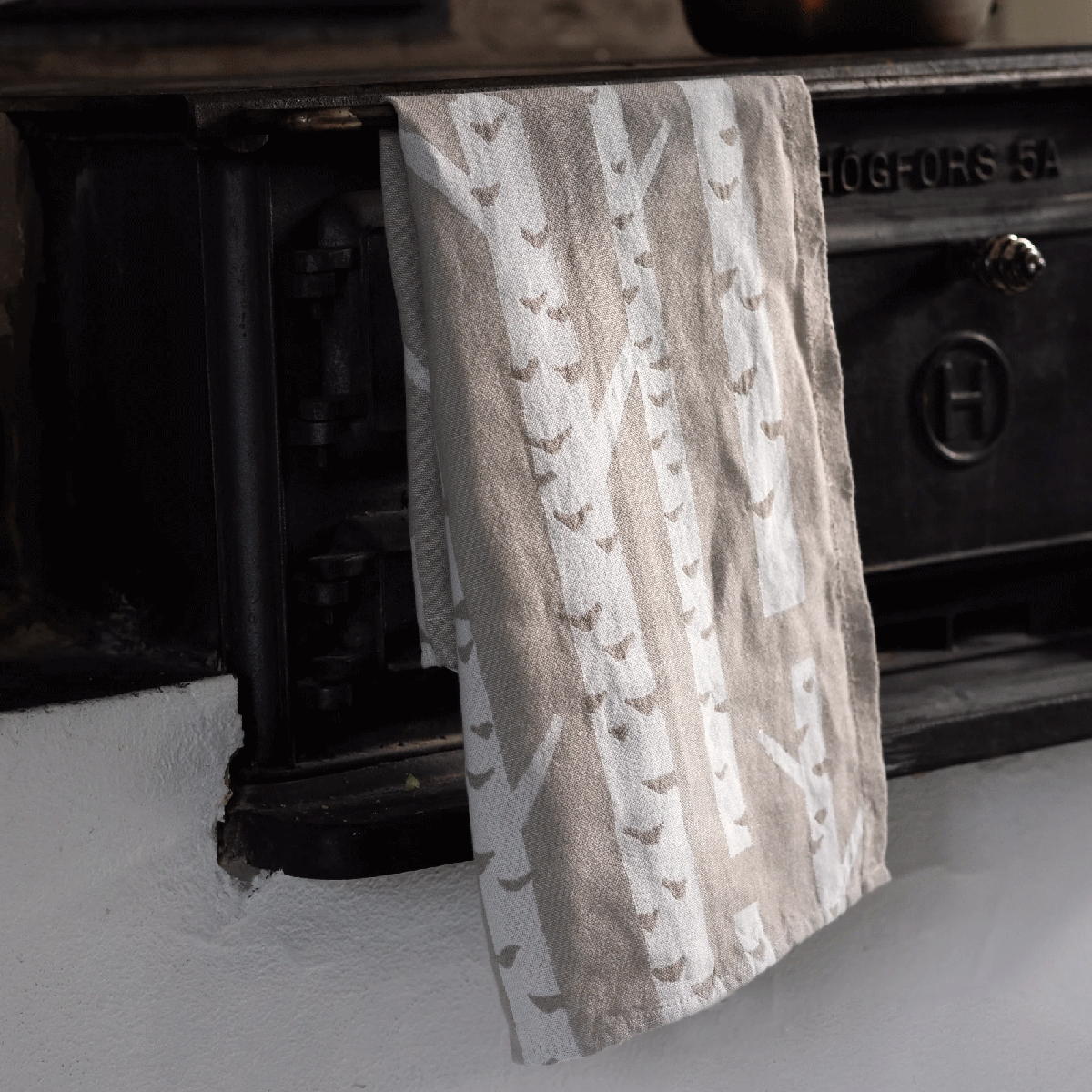 Koivu means birch in Finnish, and this Lapuan Kankurit Koivu Tea Towel is brimming with these beautiful trees. With neutral beige and white threads, display the tea towel on a oven handle or hanging loop when not in use to dry hands, cover warm pastries, line a bread basket, and more. The Lapuan Kankurit Koivu Beige Tea Towel is woven in Finland and made from a cotton and linen blend, which gives the towel a grainy texture that adds to the natural characteristic of the birch's bark.