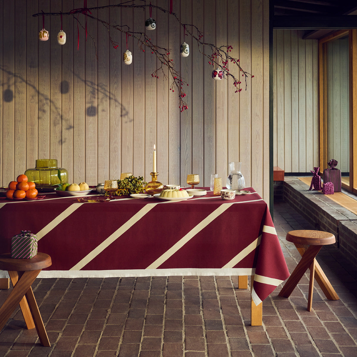 These simple stripes and captivating colors will add festive flair to your next project. In an alternating wine red and cream colorway, Maija Isola’s 1973 Basso design is a bold diagonal stripe pattern. The print will look stunning atop larger-scale home decor or fashion projects such as curtains, tablecloths, wall hangings, dresses and more. The Marimekko Basso Wine Red / Cream Fabric is made in Finland from 100% organic cotton.