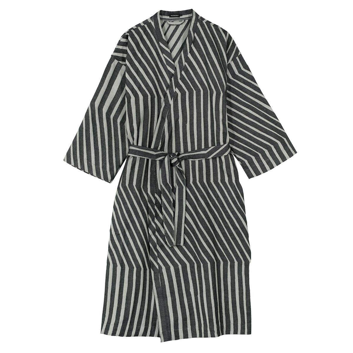 This bathrobe is both practical and fashionable, showing off an integral print in Marimekko's design archive: stripes. Created in 1962 by designer Maija Isola, the Kalasaaski (Osprey) pattern features a combination of vertical and diagonal freehand lines. The off white and charcoal colorway will be just neutral enough for any bathroom, yet the hypnotic stripes ensure bold design. The 100% organic cotton material is lightweight with a jacquard woven pattern, featuring airy sleeves, side pockets, a separate belt, and two different belt loop heights for the perfect fit.
