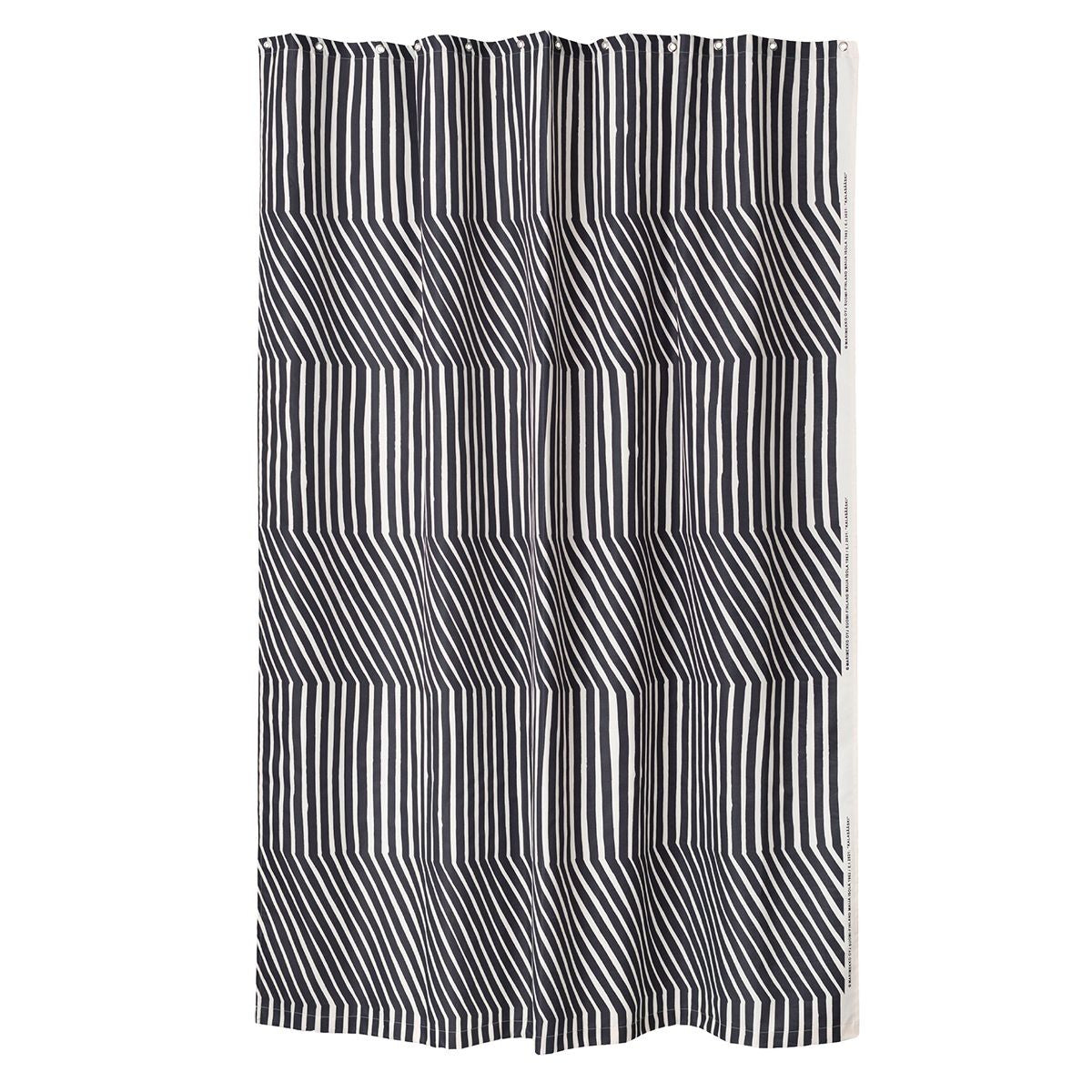This bath essential is both practical and stylish, showing off an integral print in Marimekko's design archive: Stripes. Created in 1962 by designer Maija Isola, the Kalasaaski (Osprey) pattern features a combination of vertical and diagonal freehand stripes. The off white and charcoal colorway is just neutral enough for any bathroom, yet the hypnotic stripes offer bold design. The Marimekko Kalasaaski Shower Curtain is made of 100% recycled polyester with a weighted bottom edge, and 12 small metal rings line the top of the curtain for easy hanging with shower hooks (not included). A liner is recommended.