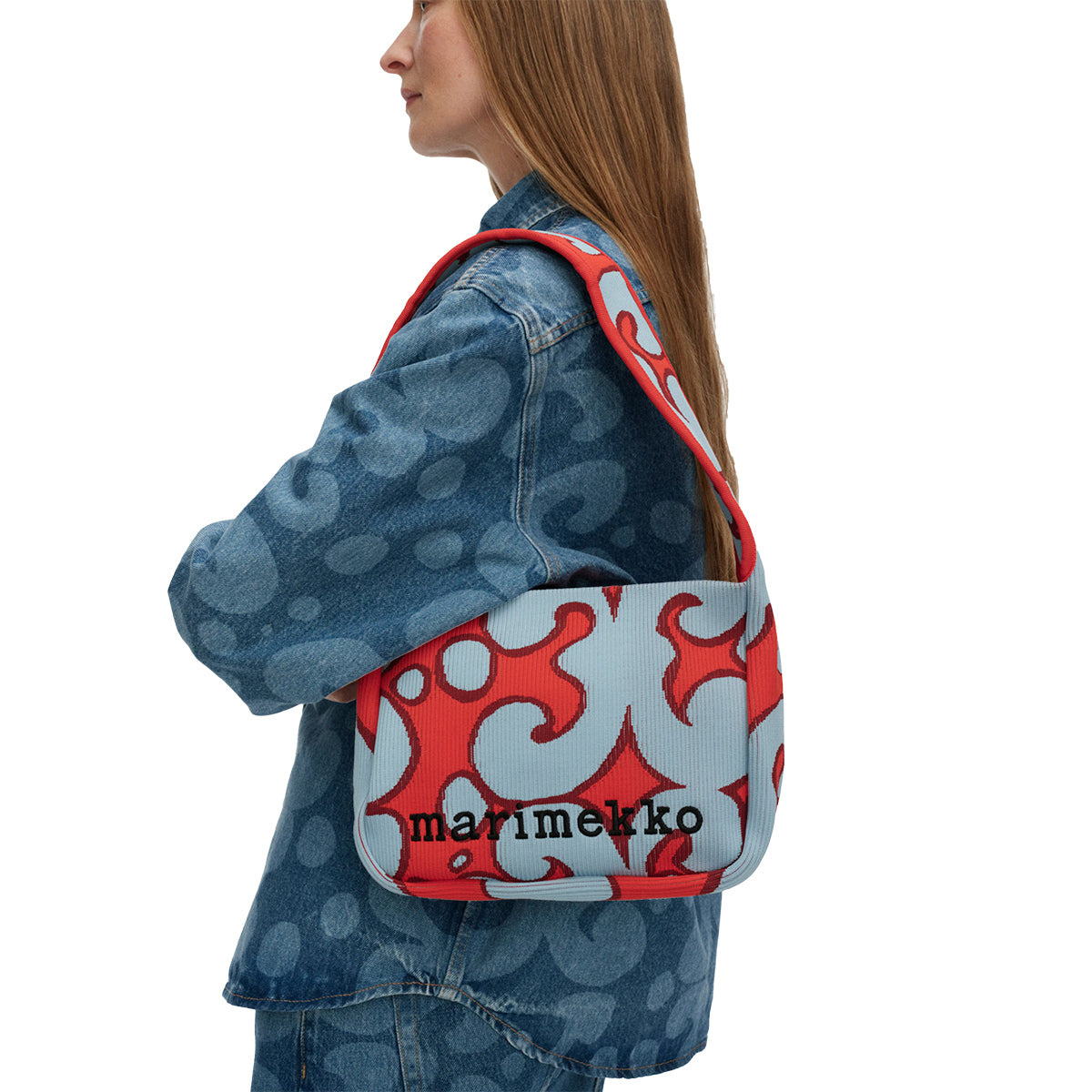 Abstract shapes in radiant red and light blue will make a statement wherever you go. The rhythmic Keidas (Oasis) pattern was created by Annika Rimala in the late 1960s, finding inspiration from the youth culture at the time. The medium size and roomy interior makes this stylish bag ideal for on-the-go errands and everyday essentials. The bag also features a wide strap for shoulder comfort, a zipper closure, and the embroidered Marimekko logo on the front. Made of durable and thick recycled polyester, the Marimekko Keidas Knitted Shoulder Bag features a jacquard knit pattern with a ribbed look for long-lasting and reliable use.