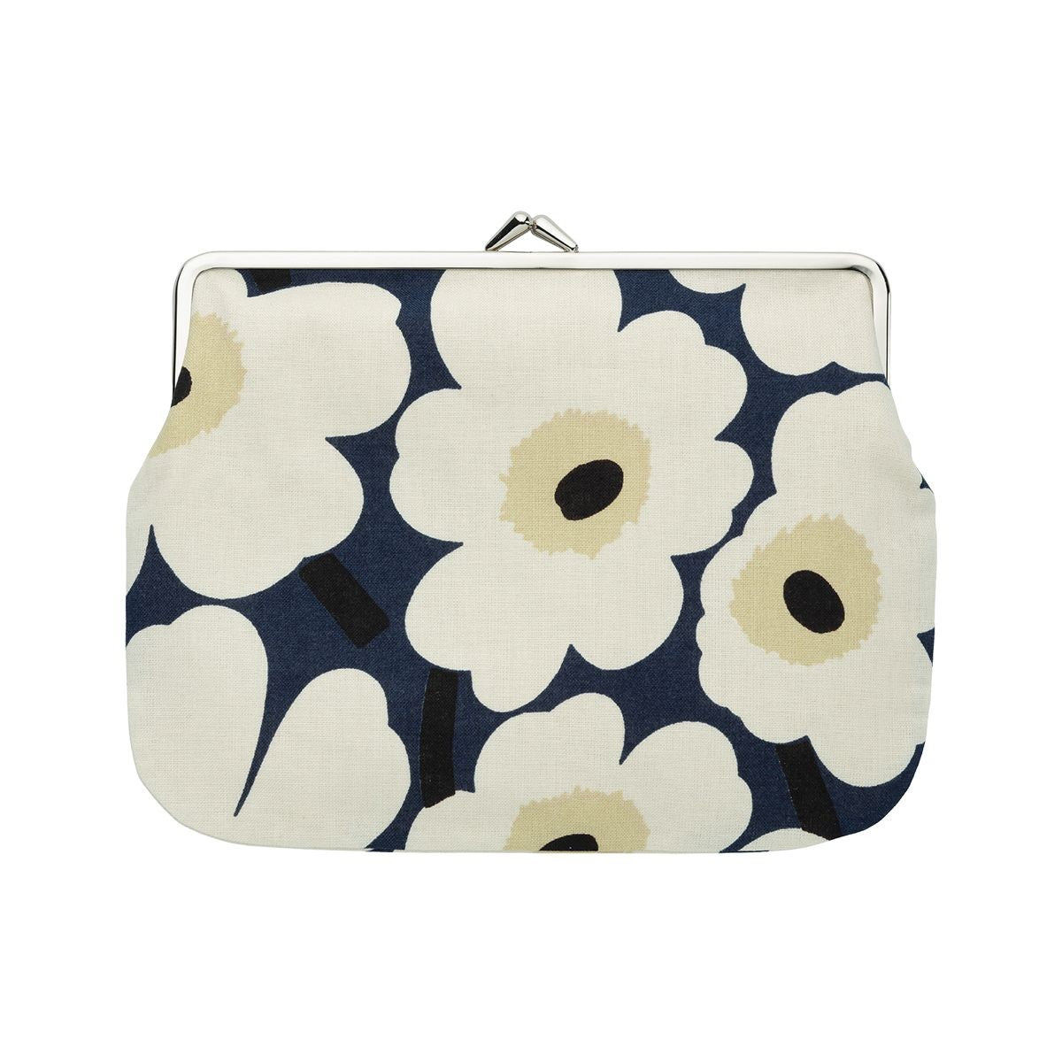 Function and iconic design bloom across this Marimekko coin purse. Maija Isola's famous poppies from 1964 are refreshed in a soothing and moody midnight blue, cream and straw colorway. With a solid cream interior lining, the large and versatile size can fit coins, cords, a phone, and other essentials with its roomy space. It is made in Finland from 100% cotton Marimekko fabric, and it conveniently snaps shut with a metallic clasp to keep your items safe and secure.