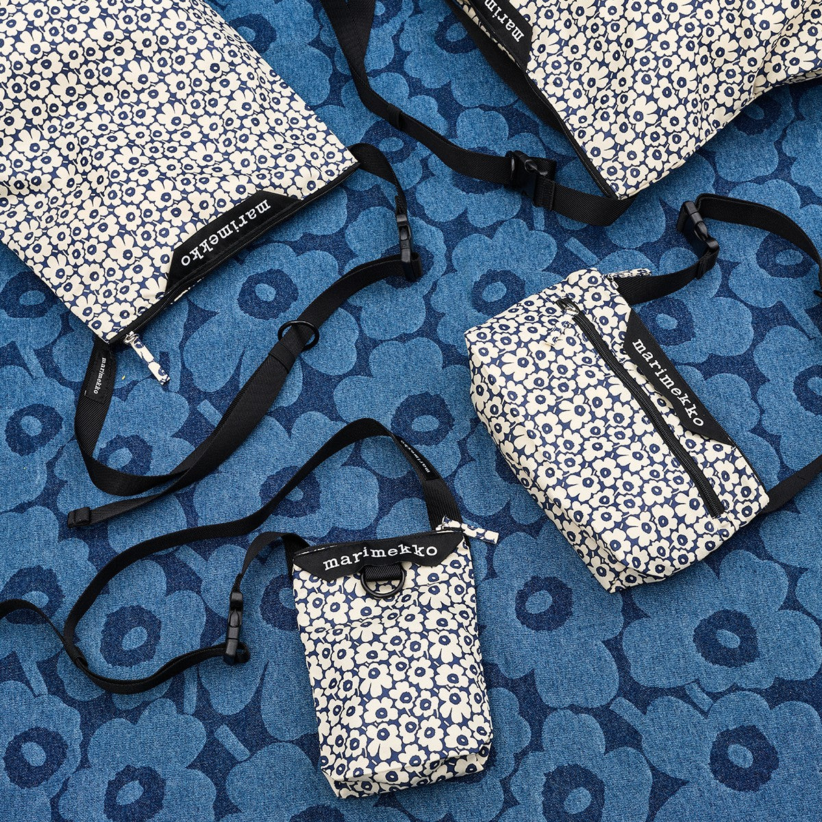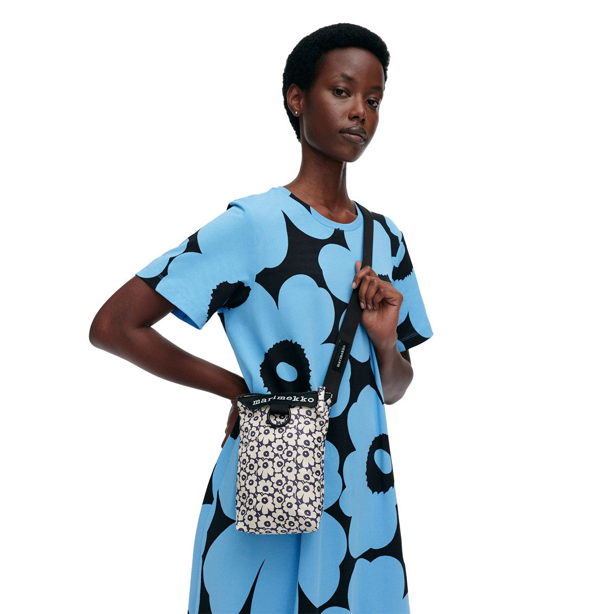 In a lovely cream and dark blue colorway, Maija Isola's famous florals are scaled down in size and bloom across the Marimekko Neat Phone Pocket. The small size will be ideal for your phone, a small wallet, a cord and other small daily essentials. The bag has an adjustable shoulder strap that is made of recycled polyamide, as well as a plastic buckle for easy removal. The Marimekko Mini Unikko Neat Phone Pocket also includes a zipper closure for safe keeping, while the Marimekko label and a keyring decorate the front.