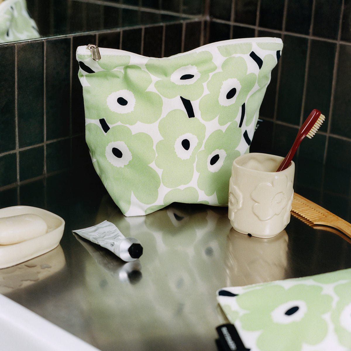 Maija Isola's Unikko pattern has delighted since its 1964 debut and proves as timeless today. Here, it's featured on a 100% cotton Marimekko cosmetic bag and refreshed in a serene sage, off white and dark blue colorway. With two interior pockets, the large bag is spacious for all of your brushes, compacts, makeup, accessories and more. The Marimekko Unikko Kaje cosmetic bag closes with a zipper for safe storage of your items, and it has a recycled polyester lining on the inside that is easy to wipe clean when needed.