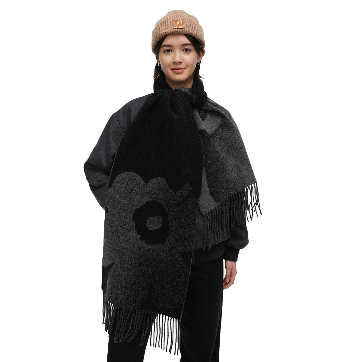 Maija's Isola's beloved poppies bloom just as boldly in the cold with the Marimekko Onnekas Unikko Scarf. Made of a wool and polyamide blend, the Marimekko scarf ensures warmth and coziness when wrapped around the neck or over the head, while the neutral black and grey colorway suits any ensemble. The jacquard knit Marimekko Onnekas Unikko Scarf features two large, faded poppies and stylish fringes at each end for cozy appeal.