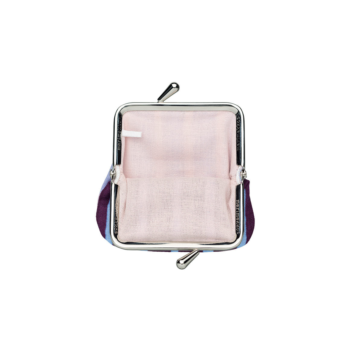Designer Vuokko Eskolin-Nurmesniemi first created the Piccolo pattern in 1953, and it has represented Marimekko's legacy of iconic stripes ever since. Atop this mini coin purse, imperfect brushstrokes alternate between light blue, dark purple and light pink, switching colorways on opposite sides. With a solid light pink interior lining, the miniature size can fit coins, mints, and other small treasures. Made in Finland from 100% cotton fabric, the Marimekko Piccolo Mini Coin Purse conveniently snaps shut with a metallic clasp to keep your items safe and secure.