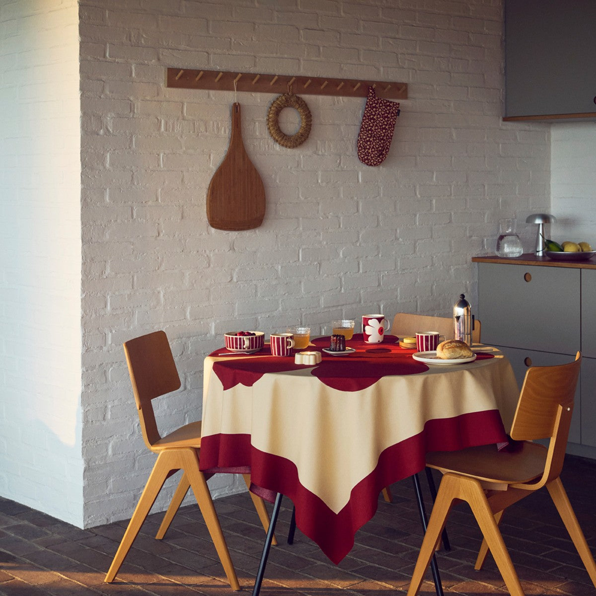This Marimekko coffee cup will deliver the perfect portion of espresso or tea with a pretty presentation. Designer Vuokko Eskolin-Nurmesniemi first created Piccolo in 1953, and it has represented Marimekko's legacy of iconic stripes ever since. The playful striped pattern is painted with vivid brushstrokes, here in a festive dark red and sand colorway. The Marimekko Piccolo Dark Red / Sand Coffee Cup is made from durable white stoneware, which is microwave, oven, freezer and dishwasher safe for long-lasting use and everyday indulgence.
