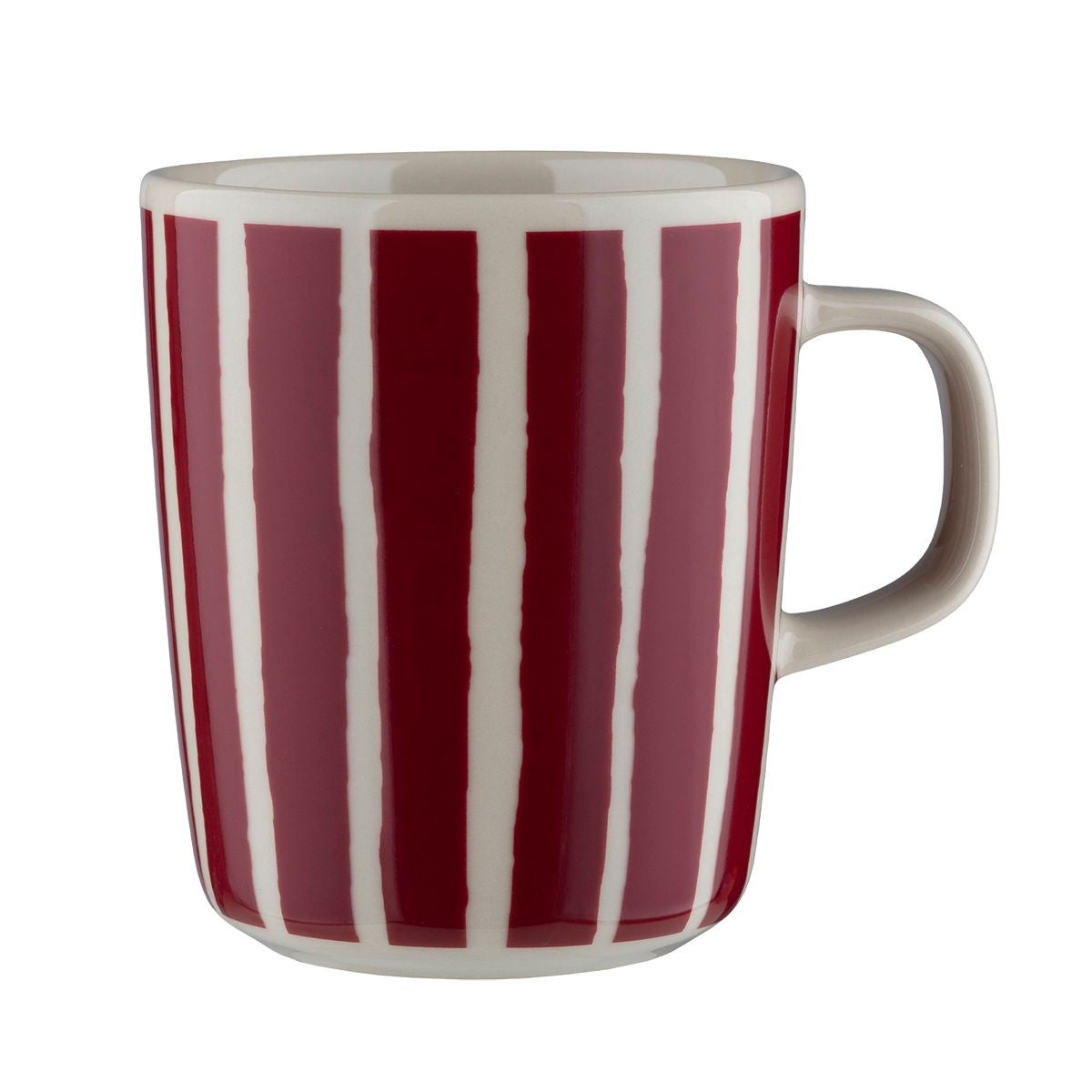 Simple stripes and captivating colors make the perfect companion to your everyday coffee and tea. Designer Vuokko Eskolin-Nurmesniemi first created Piccolo in 1953, and it has represented Marimekko's legacy of iconic stripes ever since. The playful striped pattern is painted with vivid brushstrokes, here in a festive dark red and sand colorway. Enjoy all the tasty beverages this season brings with the Marimekko Piccolo Dark Red / Sand Mug, made from durable white stoneware for everyday indulgence and long-lasting use.
