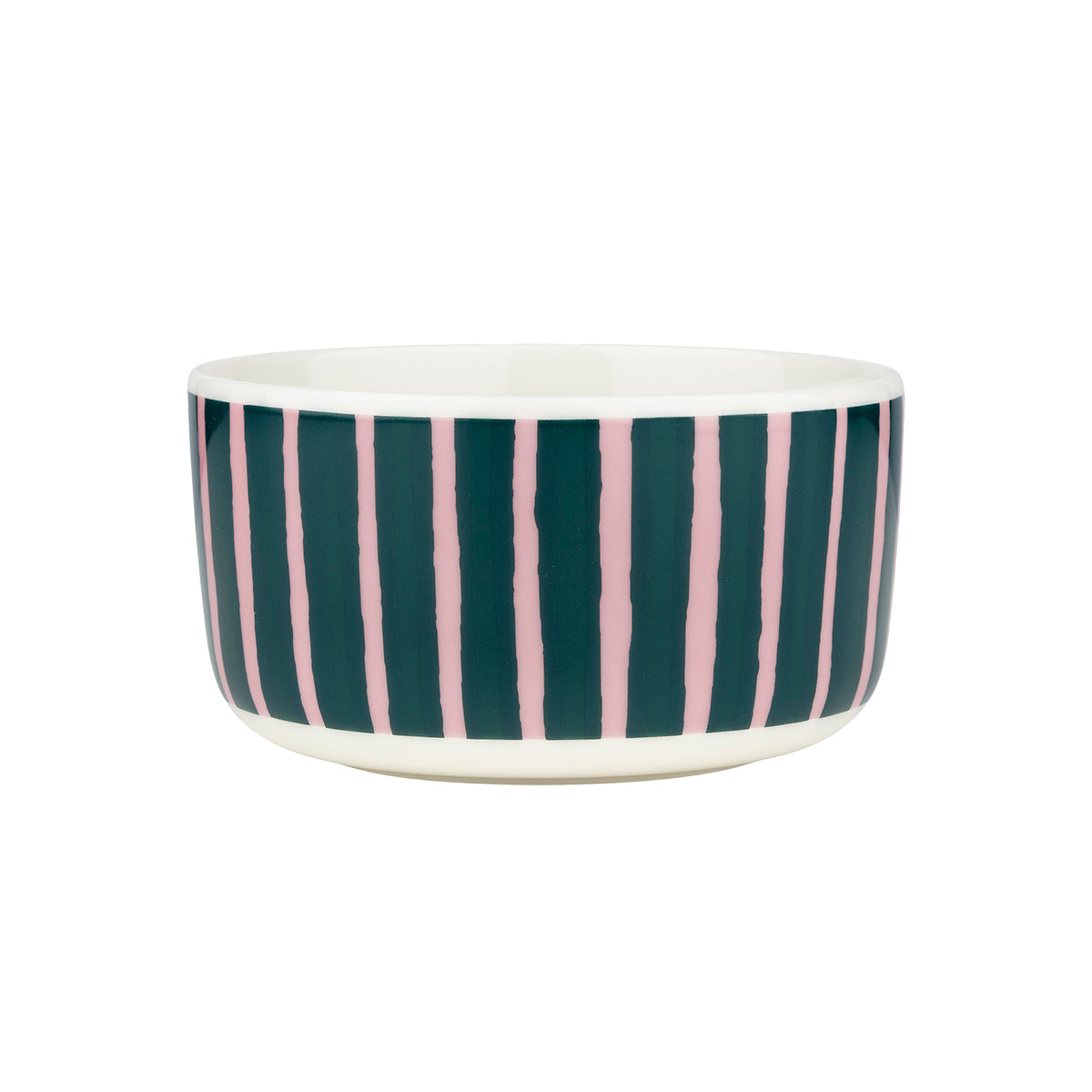 Designer Vuokko Eskolin-Nurmesniemi first created Piccolo in 1953, and it has represented Marimekko's legacy of iconic stripes ever since. This playful striped pattern is painted with imperfect brushstrokes and alternates in a unique forest green and pink colorway. Perfect for adding a splash of excitement to everyday dining, this Marimekko bowl is ideally sized for soup, cereal, yogurt, oatmeal and more. The Marimekko Piccolo Forest Green / Pink Soup / Cereal Bowl is made from durable white stoneware, and is microwave, oven, freezer and dishwasher safe.