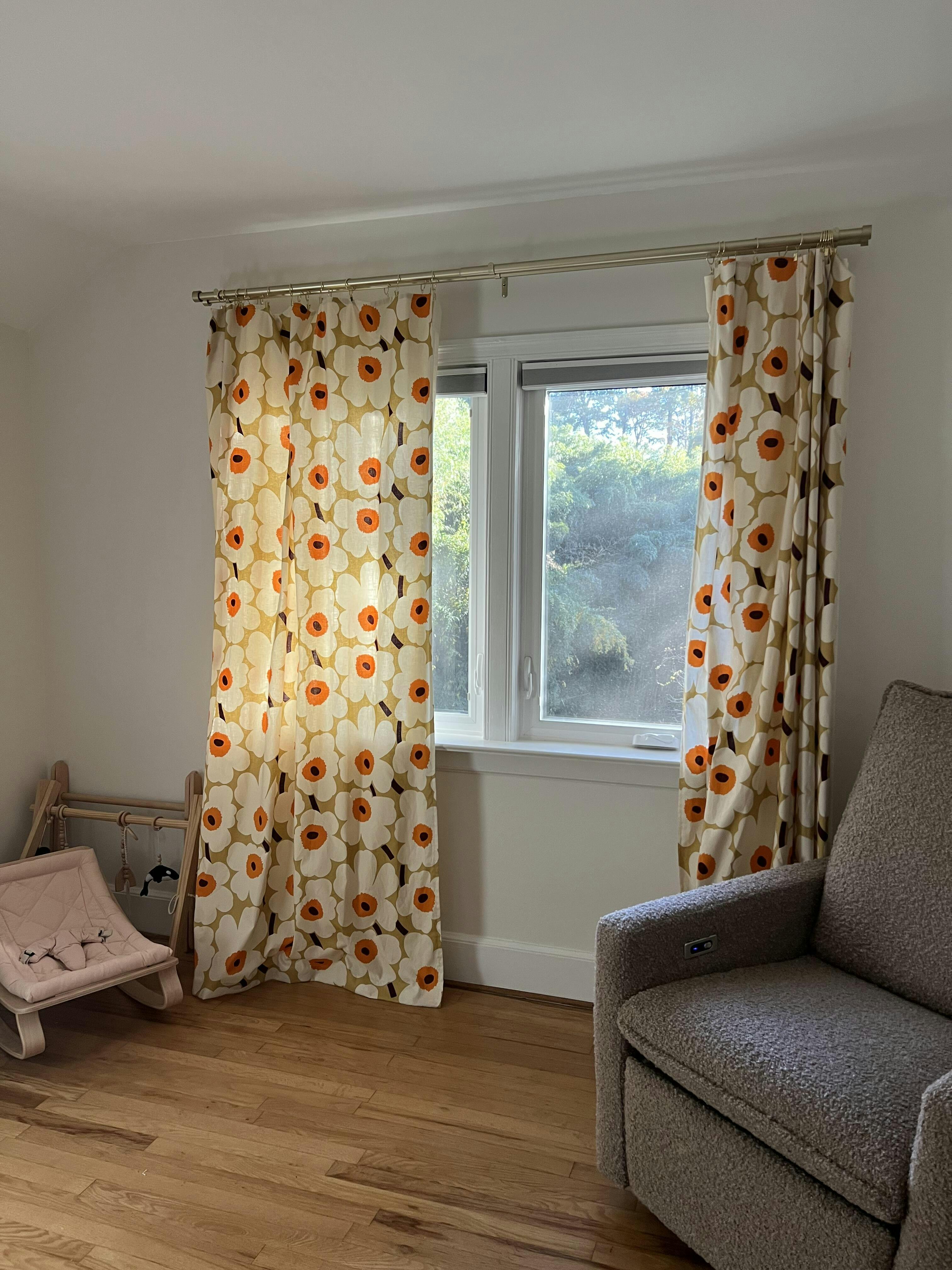 Since 1964, Marimekko's Unikko (Poppy) pattern by Maija Isola has brought blooming joy to interiors and clothing. The iconic poppies are scaled down in size to pieni (small) and refreshed in a warm caramel, off white, orange and dark burgundy colorway. Made in Finland from 100% cotton, bring these playful poppies into a room or wardrobe through a wall hanging, curtain, placemat, table linen, dress, and more.