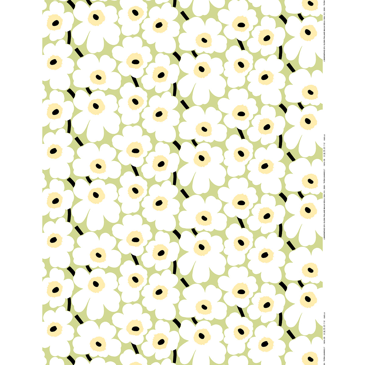 Since 1964, Marimekko's Unikko (Poppy) pattern by Maija Isola has brought blooming joy to interiors and clothing. The iconic poppies are serene and stunning in off white, pale yellow and charcoal hues atop a gorgeous pear green backdrop. Made in Finland from 100% cotton, bring these blooms in the "pieni" (small) scale into a room or wardrobe through a wall hanging, pillow, curtain, table linen, dress, and more.