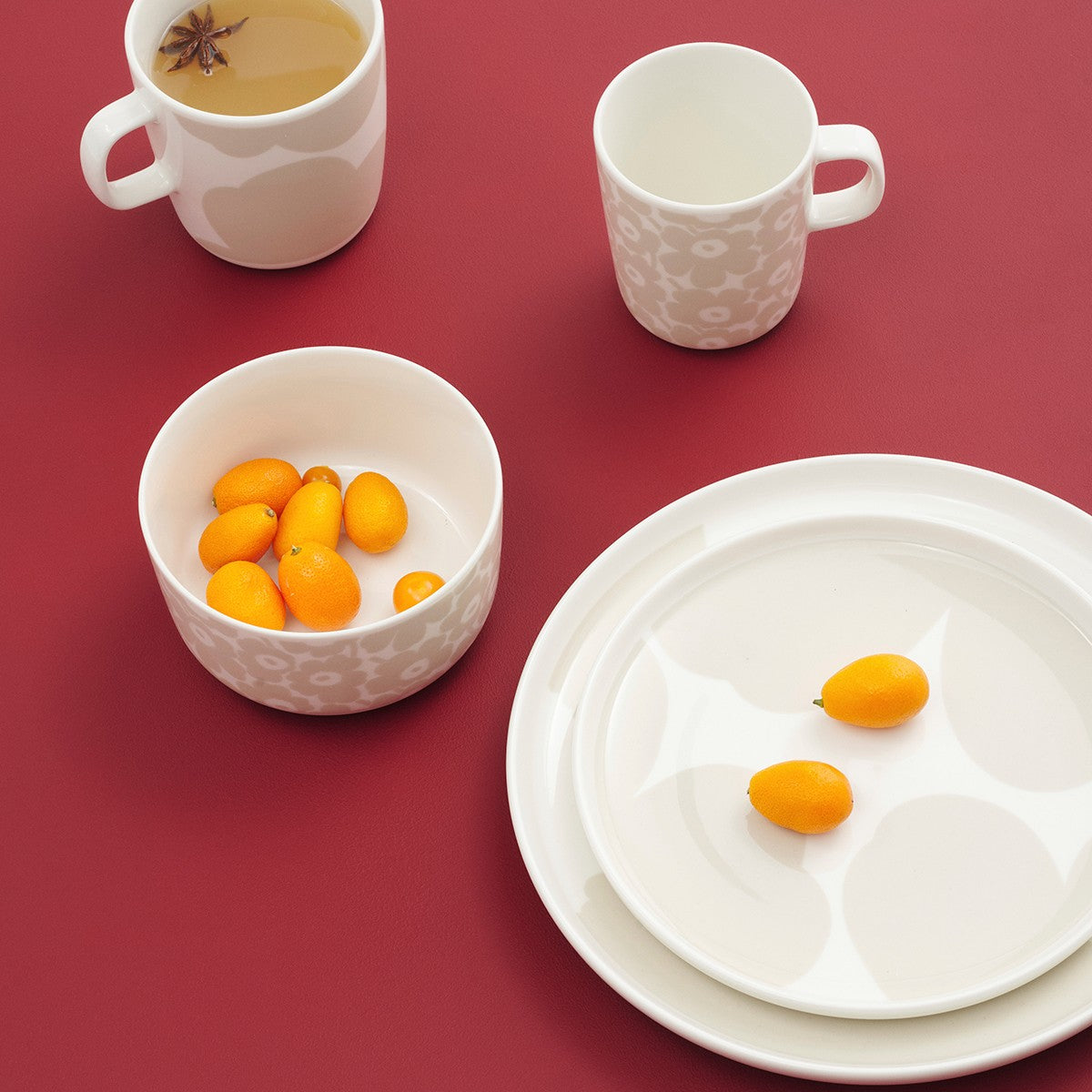 The beloved Unikko (Poppy) print by Maija Isola is scaled down in size and lovingly named Pikkuinen (The Little One) atop this Marimekko dining set. The poppies bloom in a neutral light beige colorway to suit any kitchen interior and dinnerware collection. Including two mugs and two soup/cereal bowls, the Marimekko Pikkuinen Unikko Sand / White 4pc Dining Set will be ideal for breakfast for two or everyday dining. Use the packaged set for your own indulgence or gift it to someone special.