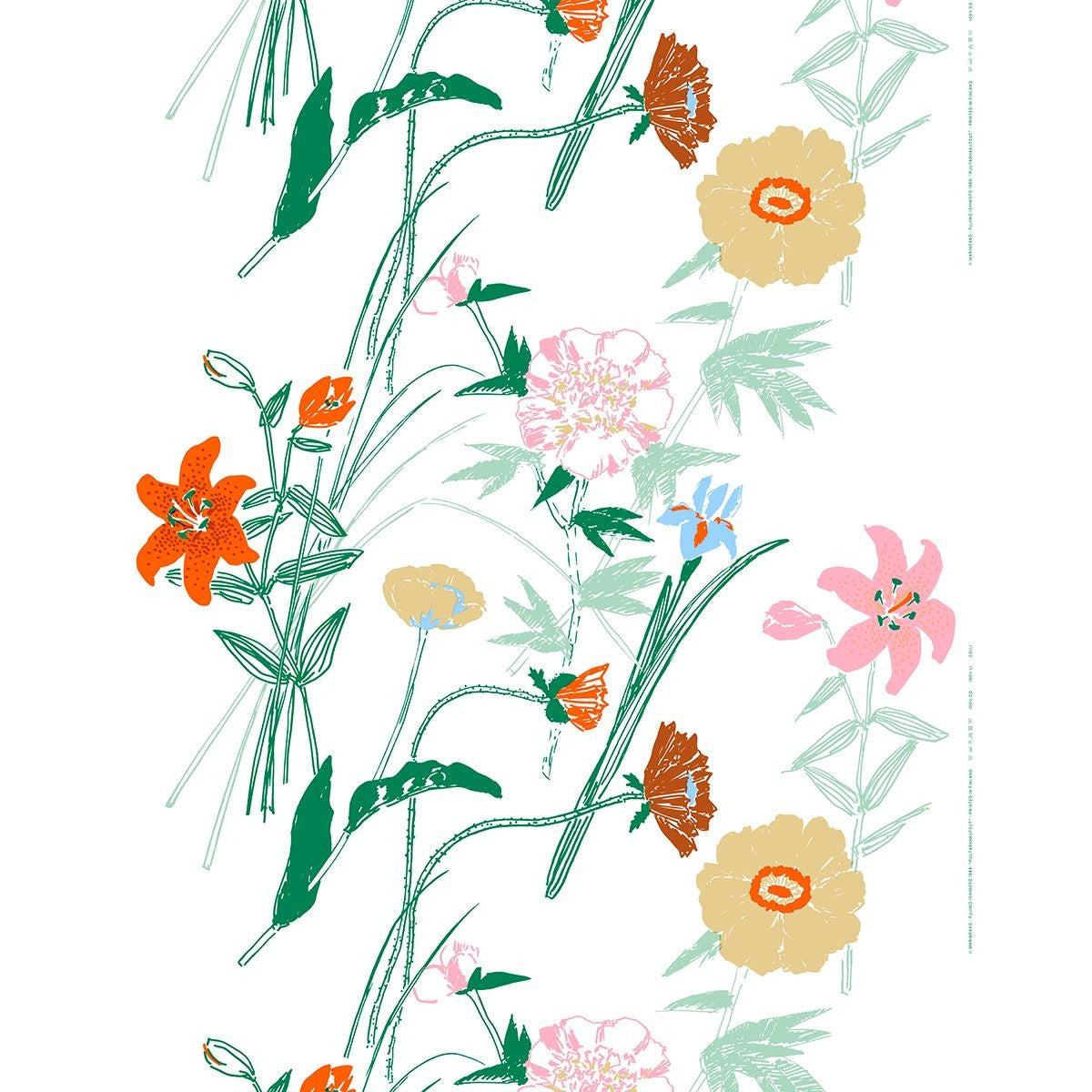 Fujiwo Ishimoto's floral Puutarhakutsu (Garden Invitation) pattern brings the ambiance of a summer garden party right into the home, any time of year. An assortment of large-scale lilies, poppies, irises, tulips and peonies decorate this Marimekko fabric in a detailed, naturalistic style. Hues of green, orange, pink, beige and light blue pop against a white backdrop, perfect for your next home decor or fashion project this spring. The Marimekko Puutarhakutsu Fabric is made in Finland from 100% cotton.