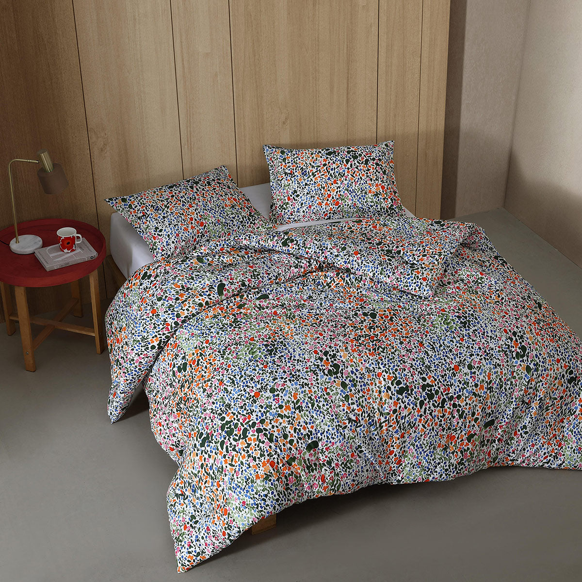 Sweet dreams are guaranteed amidst this colorful flower field. Fittingly translating to "beach meadow," designer Aino-Maija Mestola drew inspiration for the Rantaniitty pattern from the untamed beauty and vivid colors of blooming summer landscapes. Cheerful orange, green, pink, and blue hues will make any bedroom into an oasis, while the soft and crisp cotton percale material will create a luxurious sleeping experience. The Marimekko Rantaniitty King Duvet Set is machine washable and contains a 200 thread count for optimal quality.