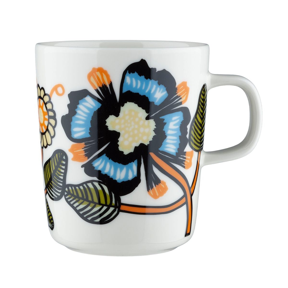Combining modern florals with vintage appeal, Erja Hirvi's lush Tiara pattern brings in the beauty of nature to any interior. Plants and flowers vine across this Marimekko mug in sun-kissed hues of orange, green and blue, illuminating the table and bringing joy to everyday dining. Holding approximately 8.5 oz, the Marimekko Tiara Mug is made of durable and dishwasher-safe white stoneware, and will be a beautiful way enjoy your morning coffee or evening tea.