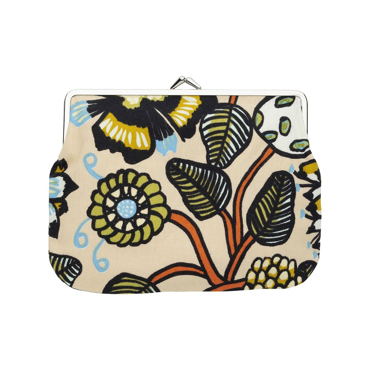 Combining modern florals with vintage appeal, Erja Hirvi's lush Tiara pattern brings in the beauty of nature to any interior. Plants and flowers vine across this large Marimekko coin purse in sun-kissed hues of orange, green, and blue, which illuminate against a light orange backdrop. With an orange interior lining, the large and versatile size can fit coins, cords, a phone, and other essentials with its roomy space. It is made in Finland from 100% organic cotton Marimekko fabric, and it conveniently snaps shut with a metallic clasp to keep your items safe and secure.